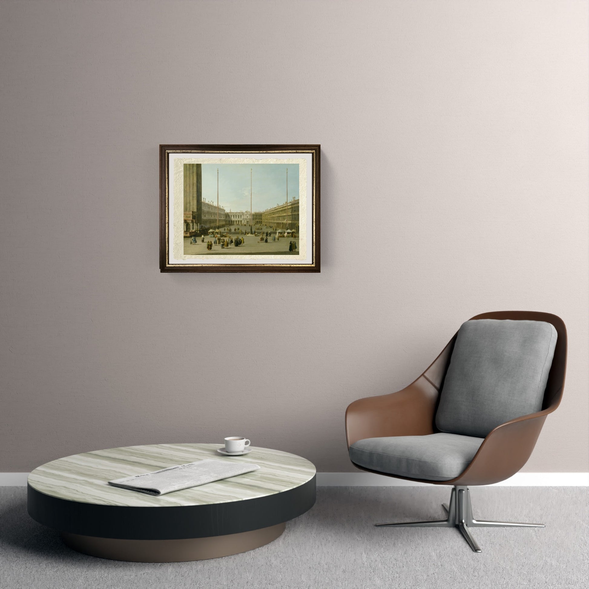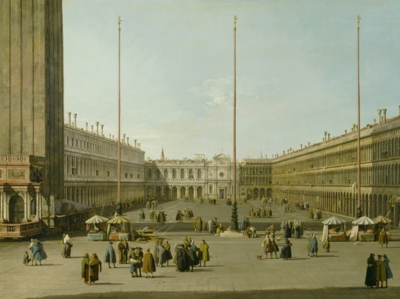 Original 18th-century view of Piazza San Marco with the Church of San Geminiano in the background, painted by Giovanni Antonio Canal, known as Canaletto. In the foreground there is the rectangular square, with the large bell tower of San Marco on the left. Behind the bell tower there is a large Venetian palace overlooking the square.
