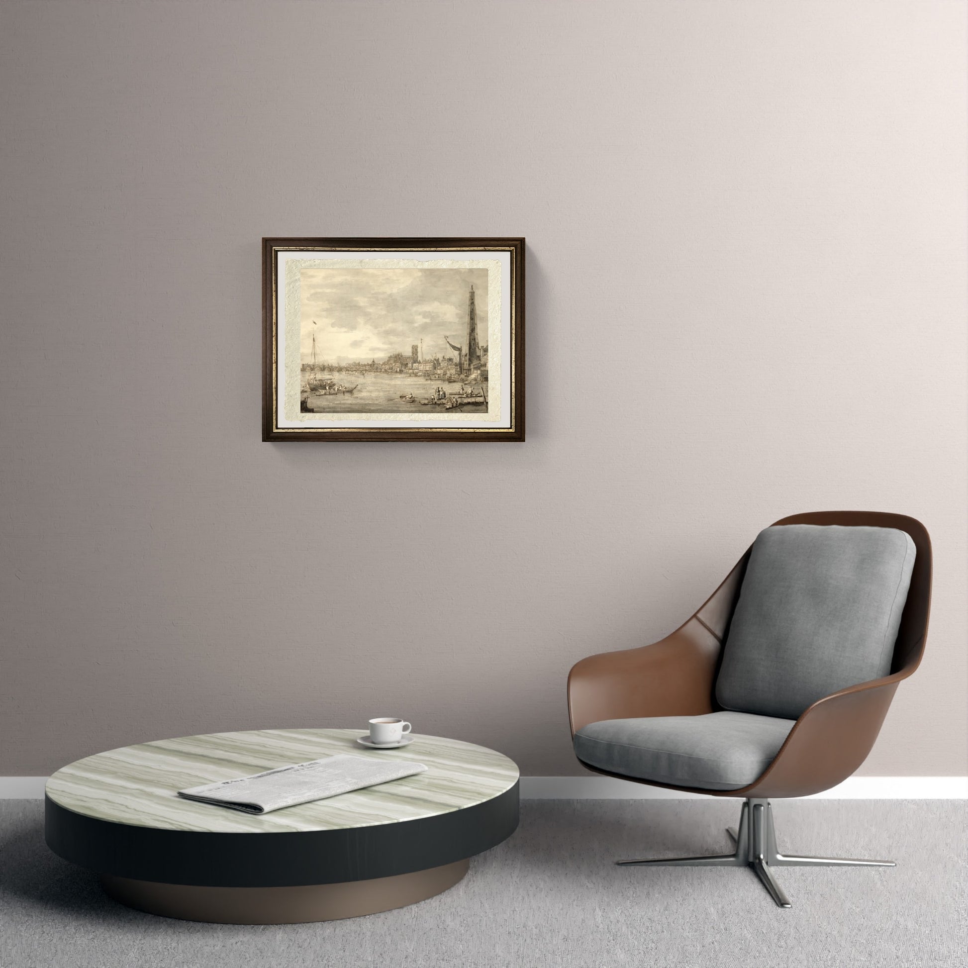 Original and luminous 18th-century view of the Thames with Westminster Bridge in London, painted by Giovanni Antonio Canal, known as Canaletto. Canaletto's technique is pen and brown ink with gray wash on paper. The great London river, with its boats of various sizes, stands out, while Westminster Bridge can be seen in the background. On the right bank of the Thames, London buildings and the lighthouse can be seen. The sky has dark clouds on the horizon, but the day remains clear.