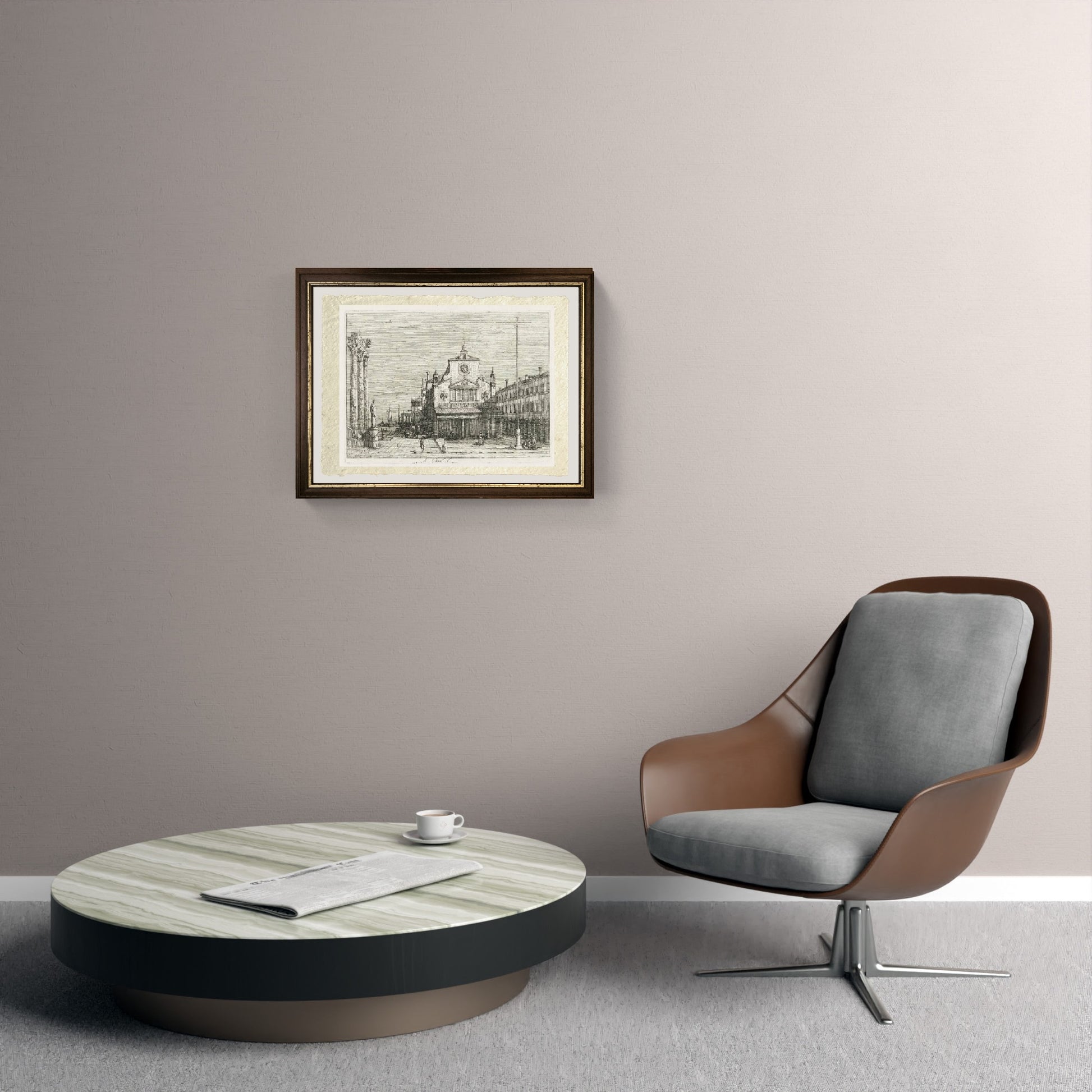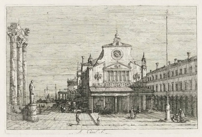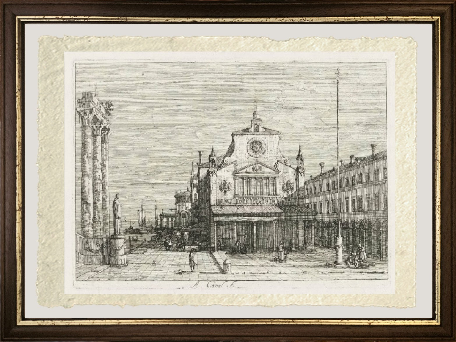 A rare 18th-century engraving of three ancient columns and a statue, created by Giovanni Antonio Canal, known as Canaletto. Highlighted on the left side there are the three Corinthian-style columns, in front of which there is a statue looking out over the small square in front of a church with a portico. The square depicts scenes of everyday life, while the columns are very old, perhaps the remains of an ancient temple. The sky is clear; the engraving is undated.