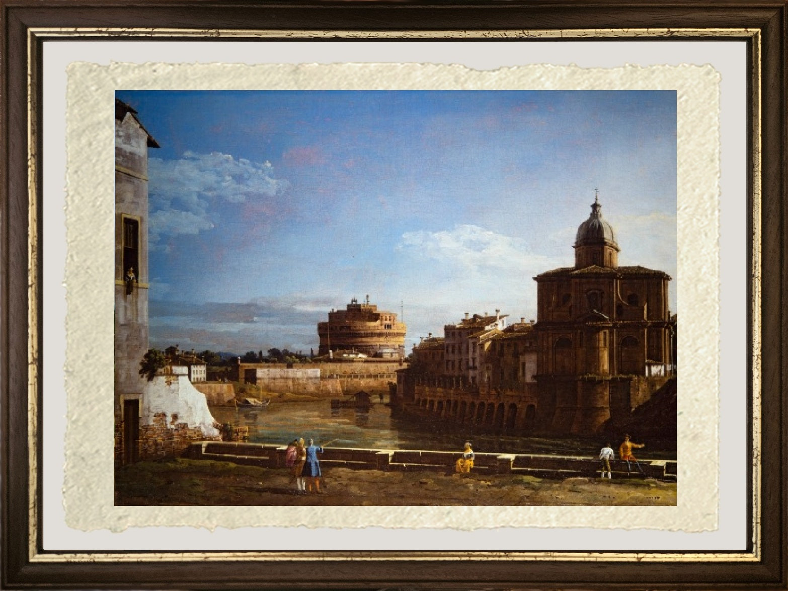 Romantic and rare historical view of Rome, highlighting Castel Sant'Angelo, painted by Bernardo Bellotto. Rome is depicted in the distance, with the Tiber River seemingly flowing toward the viewer. Castel Sant'Angelo is visible in the center, while on the right are a church and Roman buildings, rising within the retaining walls of the Tiber River. On the opposite bank, in the foreground, is a balustrade with observers gazing out over the landscape. The sky is clear with a few white clouds. Two other versions of this work exist.