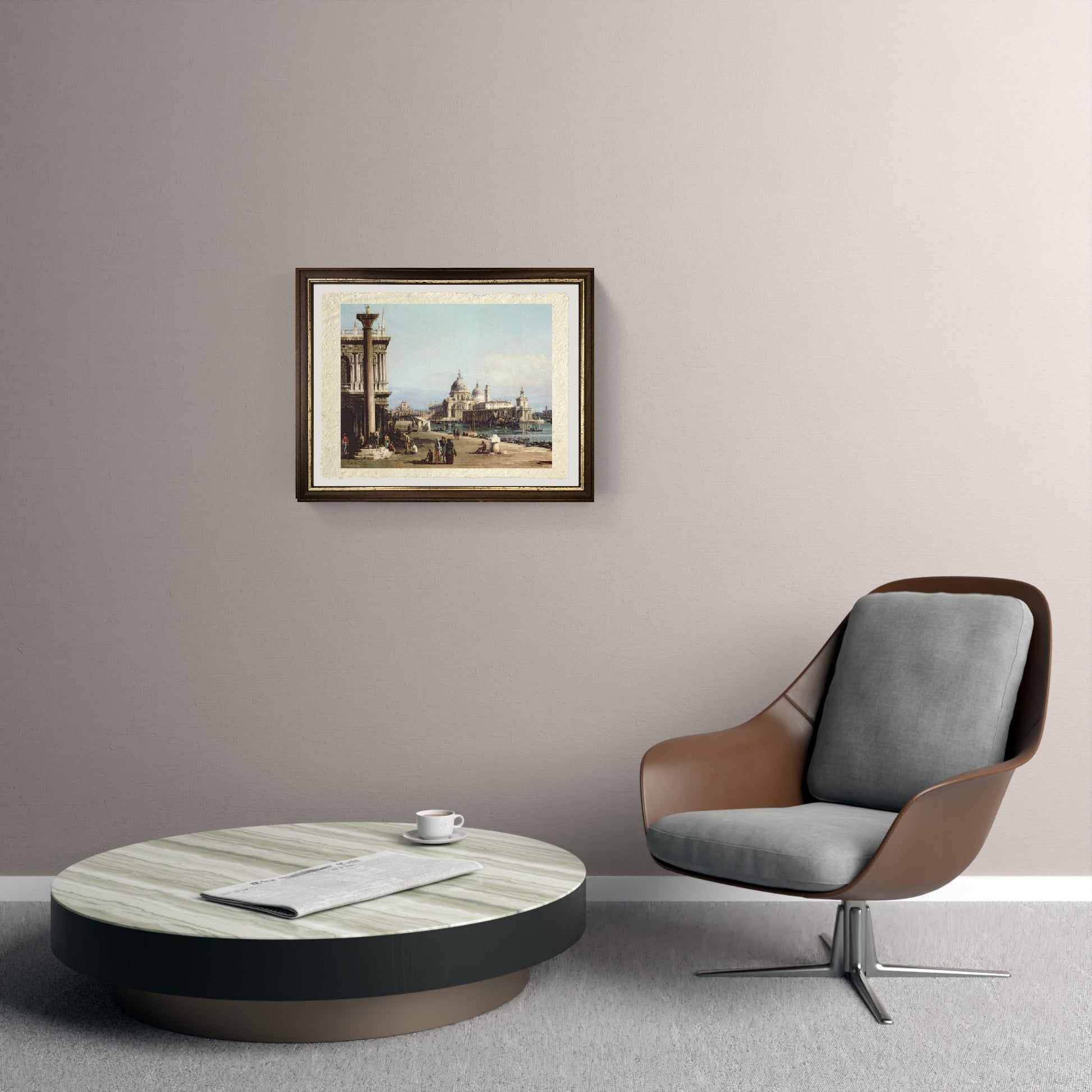 A magnificent and clear view of Venice, highlighting the San Marco basin and the Church of Santa Maria della Salute, painted by Bernardo Bellotto. On the right side, the Grand Canal is visible, with boats of various sizes moored. The foreground depicts the small square, with the Column of Venice. A clear, sunny sky dominates, with a few clouds. The oil on canvas painting is undated.