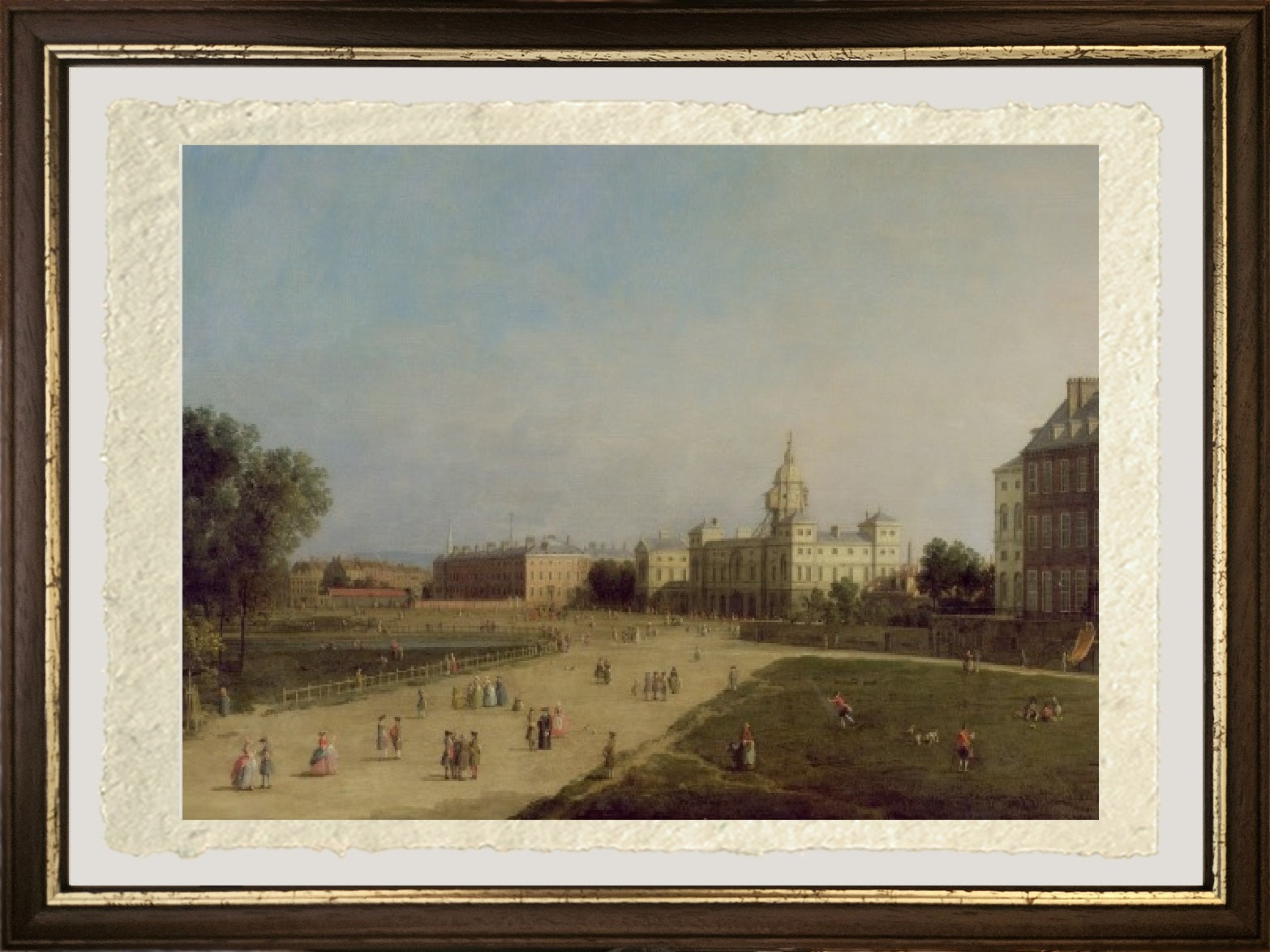 Original and rare 18th-century view of London gardens, painted by Giovanni Antonio Canal, known as Canaletto. In the foreground there are the gardens, with their long avenues, and the green spaces, both crowded with people. On the right, in perspective, there are some Anglo-Saxon-style London buildings, illuminated by the setting sun. The sky is clear, with no clouds on the horizon.