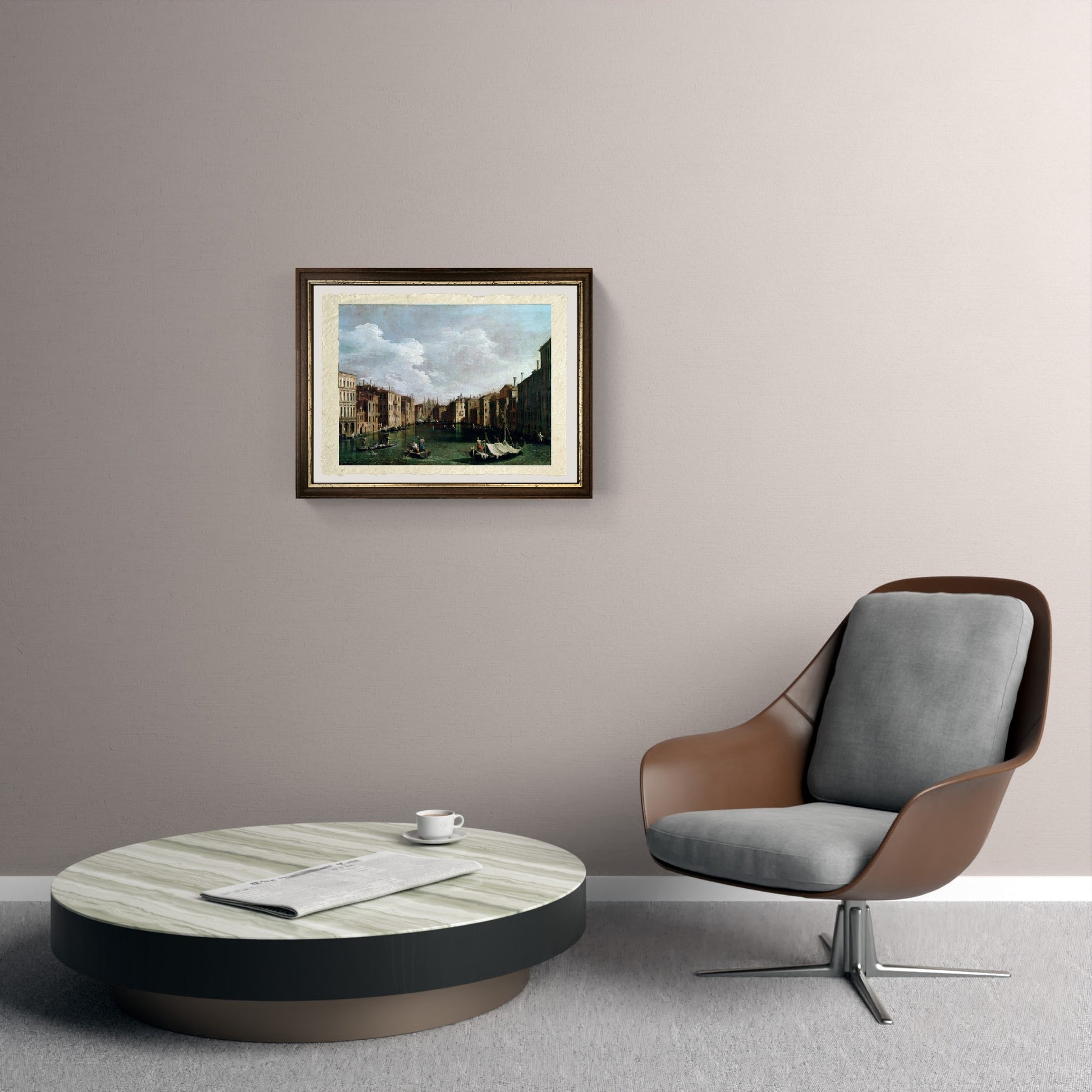 Original 18th-century depiction of the Grand Canal in Venice, painted by Giovanni Antonio Canal, known as Canaletto. In the foreground there is the Grand Canal, with the water painted by Canaletto in shades of light green and blue, and the boats navigating it, including several gondolas. On either side of the Grand Canal there are beautiful Venetian palaces. The sky is clear, with a few white clouds on the horizon.