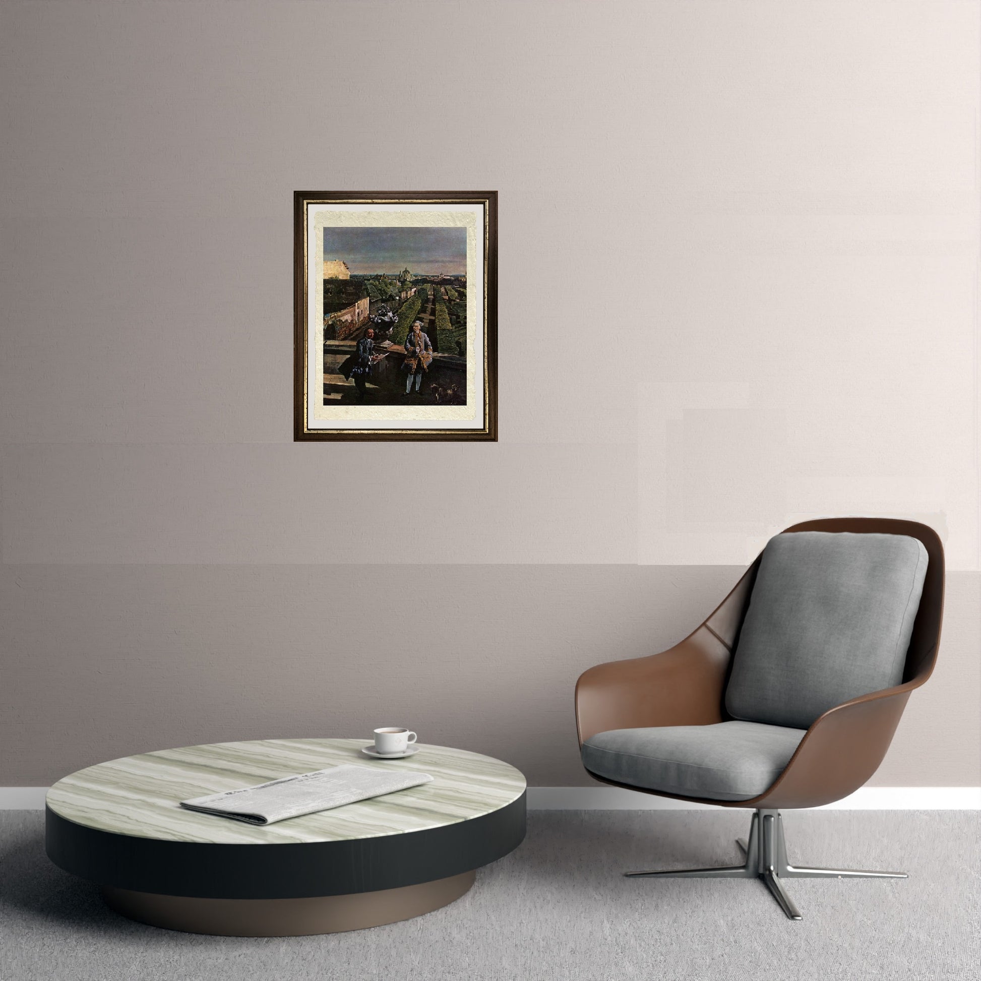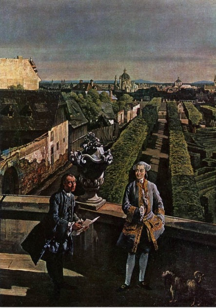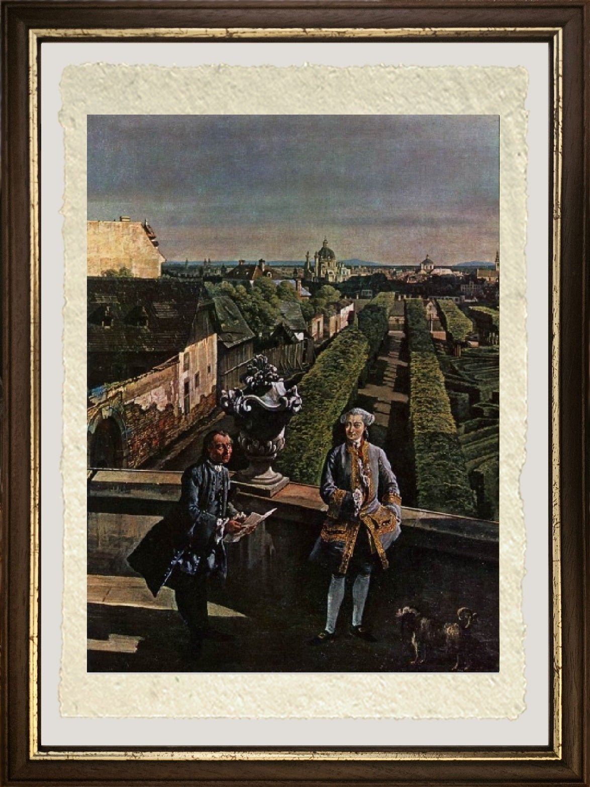 Original and interesting eighteenth-century view from the balcony of the Palais Kaunitz in Vienna, painted by Bernardo Bellotto. There are two noblemen conversing at the centre of the scene. The view from the balustrade is marvelous, with the Italian gardens in the background.