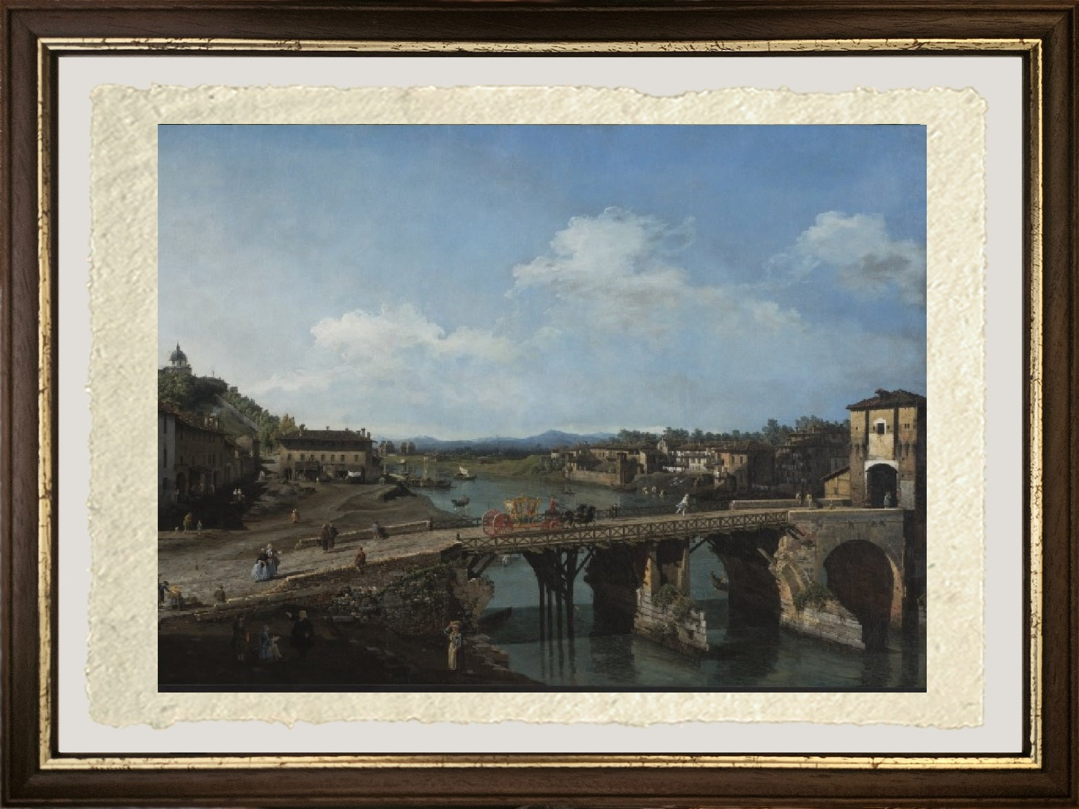 Original and rare view of the Po River in Turin, highlighting a bridge, painted by Bernardo Bellotto. The bridge was built over an ancient Romanesque bridge and features iron columns. Carriages and travelers on horseback cross it. On the right side there is a customs gate to Turin, while buildings can be seen on both sides of the Po River. The sky is clear, with a few white clouds on the horizon. The painting is dated 1745.