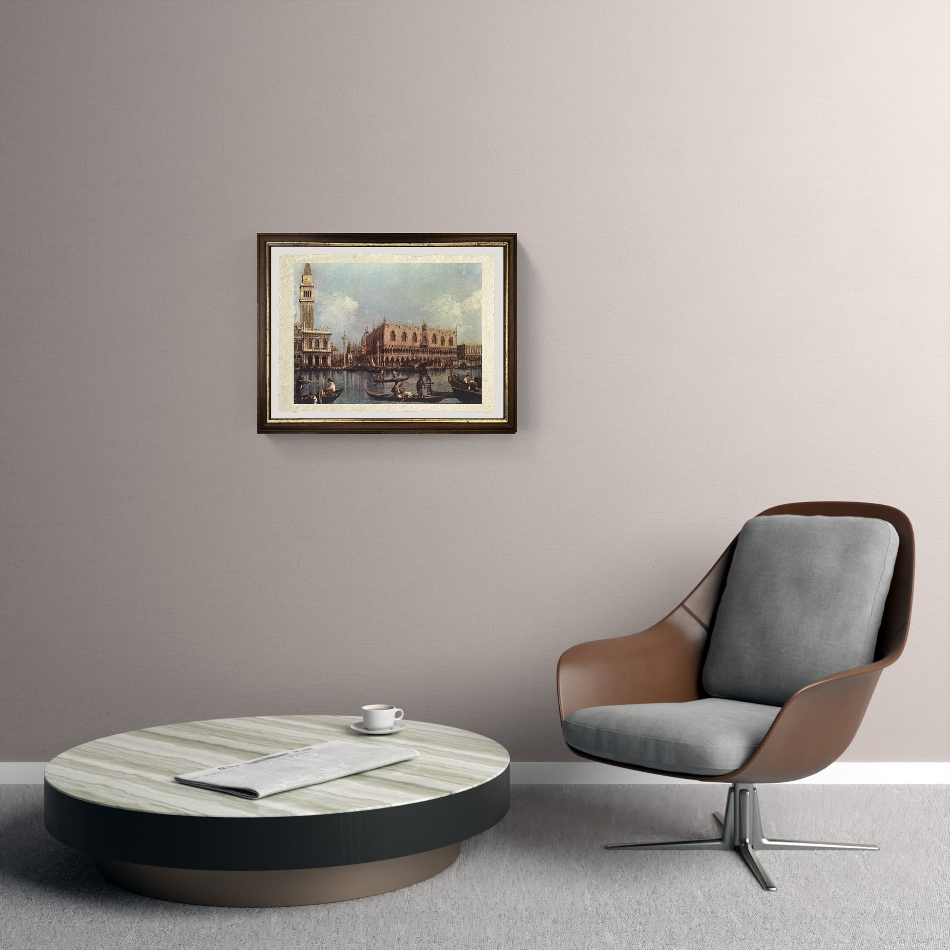 An original and luminous depiction of the Venice basin, painted by Giovanni Antonio Canal, known as Canaletto. In the foreground there is the basin with all the boats, some anchored on the shore, while others are sailing along the Grand Canal. The painting depicts the Doge's Palace, the bell tower of St. Mark's, and the other buildings in the square. The sky is clear, with a few light pink clouds on the horizon.