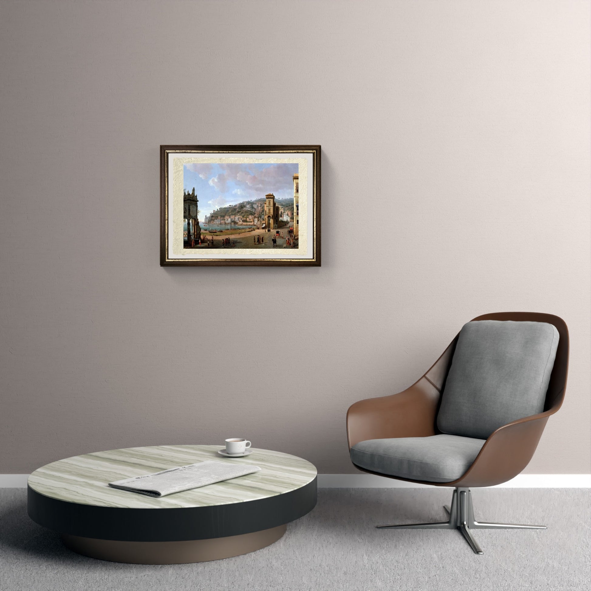 A highly prized and refined historical view of the Chiaia district of Naples painted by Gaspare Vanvitelli. The painting's perspective is striking. Painted in soft tones, it depicts a square filled with people going about their business. The sky is clear with a few clouds, and the light is morning. There is another version of this painting with a reverse perspective and lighter colors.