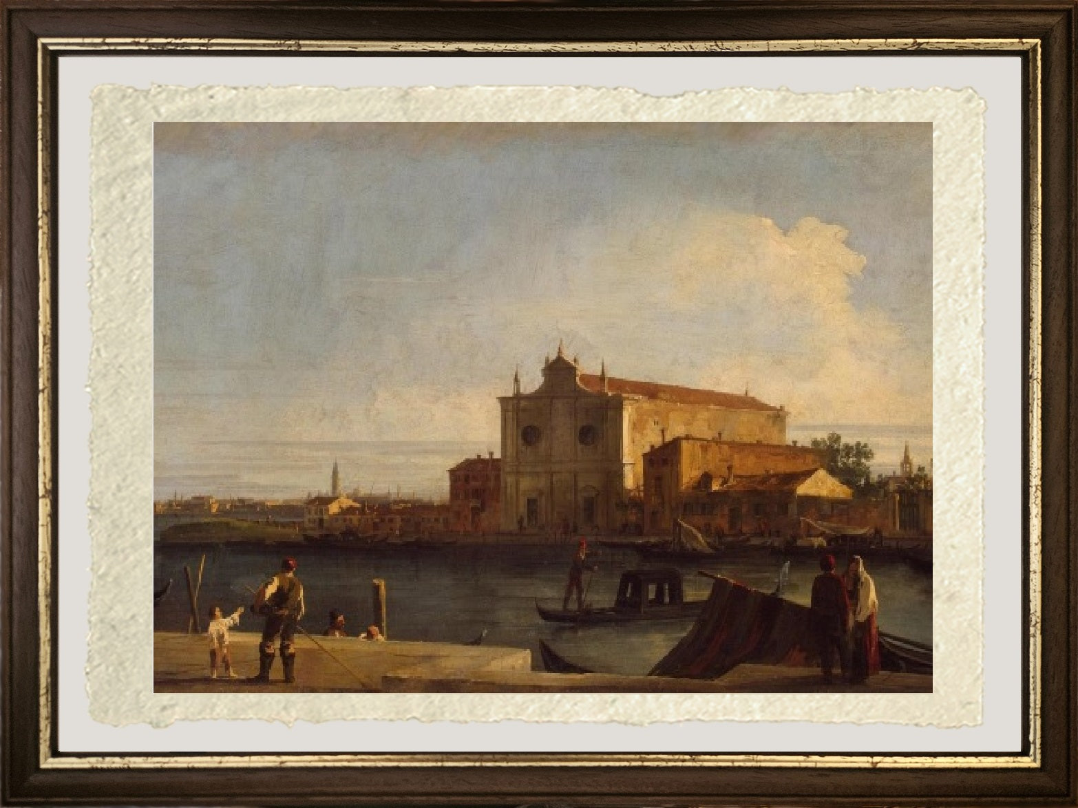 Original and rare 18th-century painting of the church of San Giovanni dei Battuti in Murano, by Giovanni Antonio Canal, known as Canaletto. The view is from this side of the lagoon, with a figure observing the church, located on the other side of the island of Murano. The church has a fine façade, but Canaletto depicts it in the shadow of the setting sun. Beyond the church, other buildings and bell towers in villages near the island of Murano can be glimpsed, but their outlines are blurred. The sky features a few white and pink clouds on the horizon.