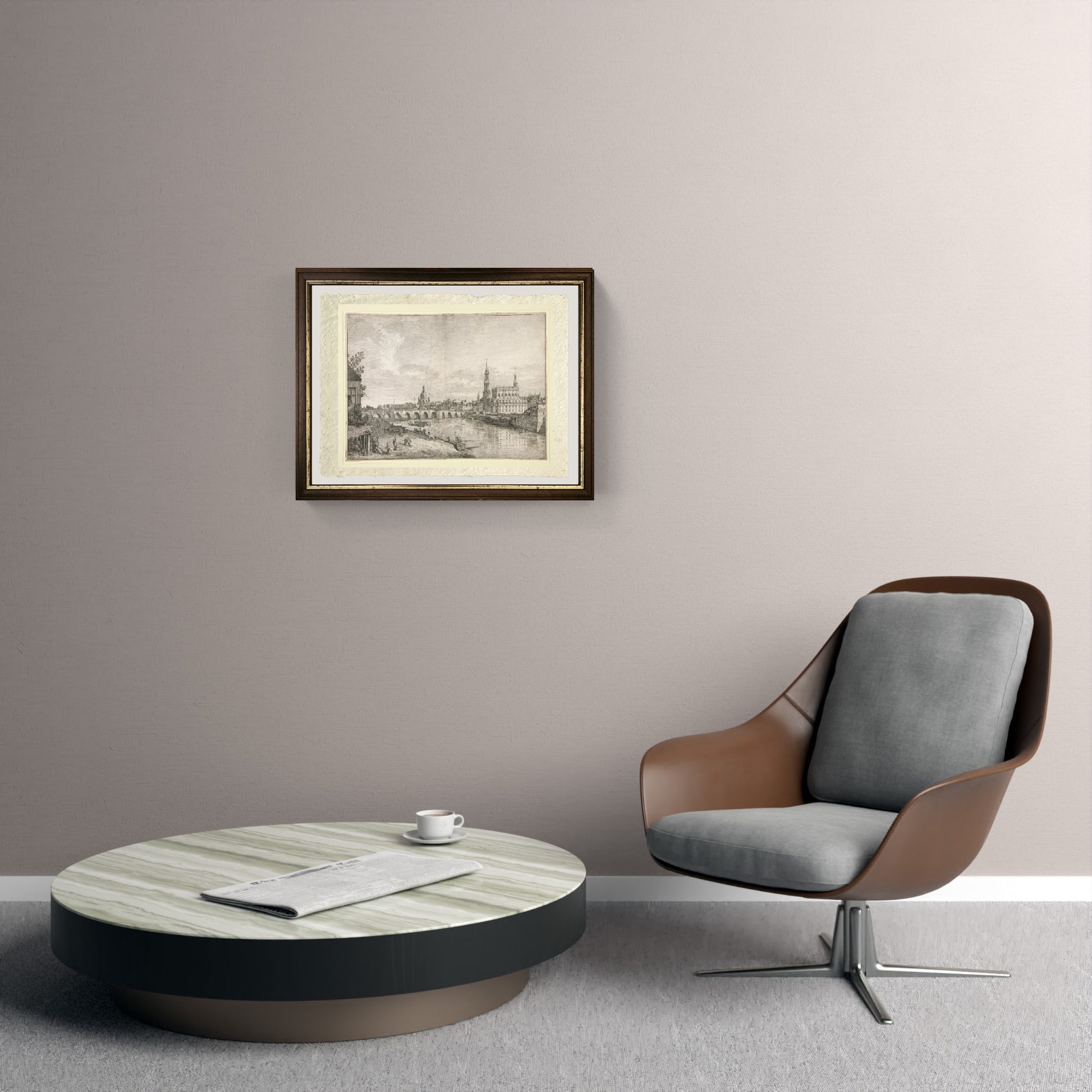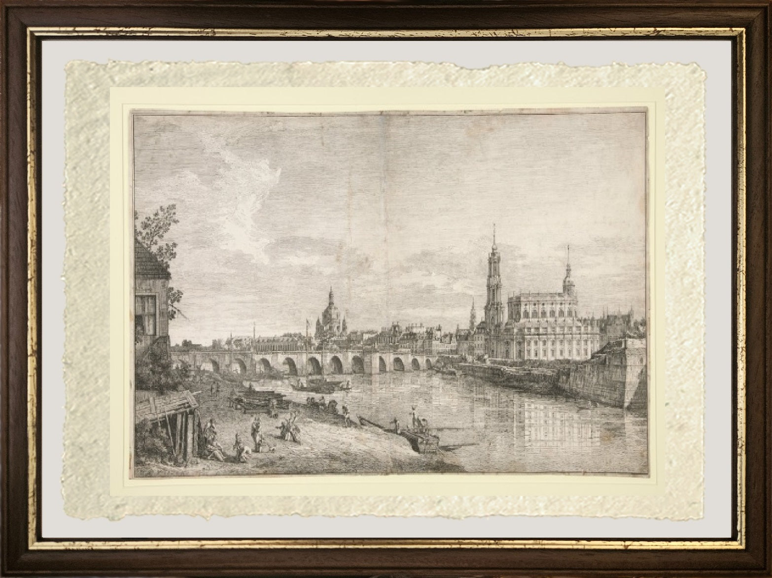 A clear and vivid 18th-century engraving of Dresden with the Augustus Bridge, created by Bernardo Bellotto. The great Elbe River stands out, dividing the city, connected by the historic Roman Augustus Bridge, reflected in the river. On the right, the church can be admired, while in the foreground, on the opposite bank, are boats. The theme of the painting is the Augustus Bridge with its beautiful and powerful Roman arches, permanently connecting the two banks of the Elbe. The sky, painted by Bellotto with light shades and a few clouds, is undated. The painting is undated. It is one of 14 views of the city of Dresden that Bellotto painted during a stay there.