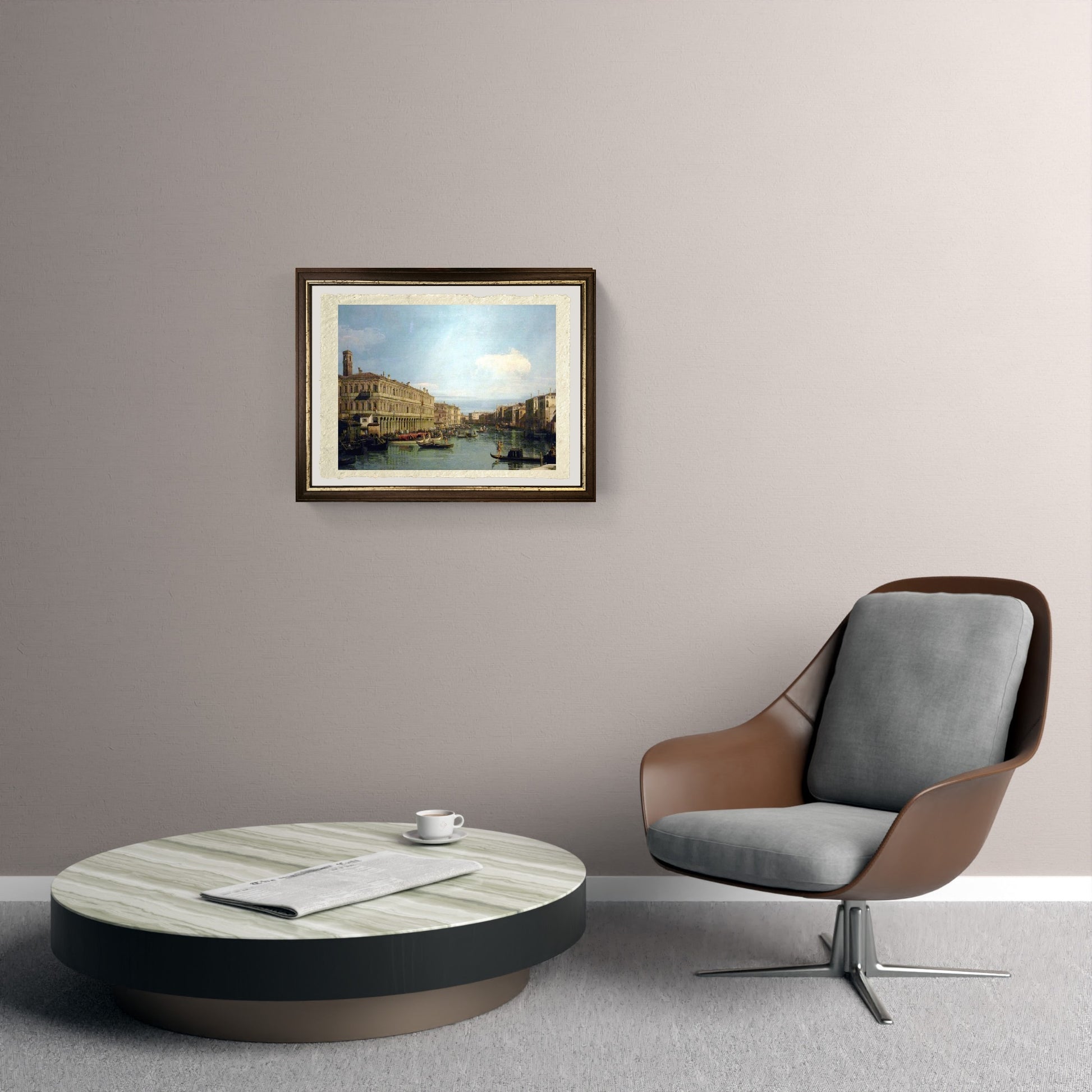 Original and rare 18th-century painting of the Grand Canal by Giovanni Antonio Canal, known as Canaletto. In the foreground there is the Grand Canal, bustling with boats, surrounded by beautiful Venetian palaces. Canaletto painted the canal water with shades of blue-green, taking on a color similar to that of the sky. A particular detail is represented by the numerous boats neatly moored in front of the palace on the left bank of the canal; there is likely a reception in progress.