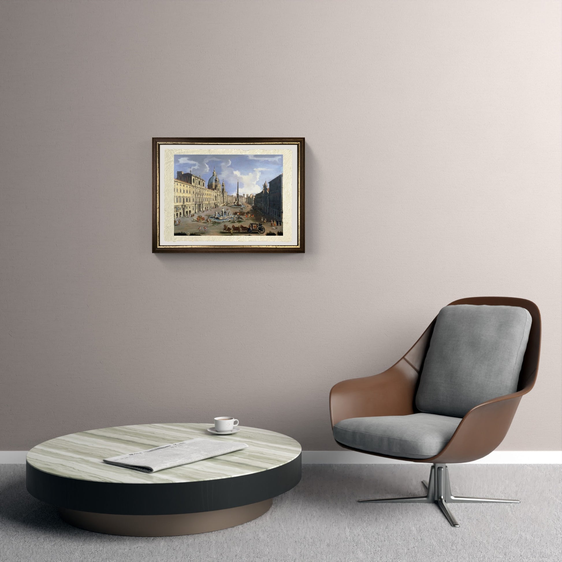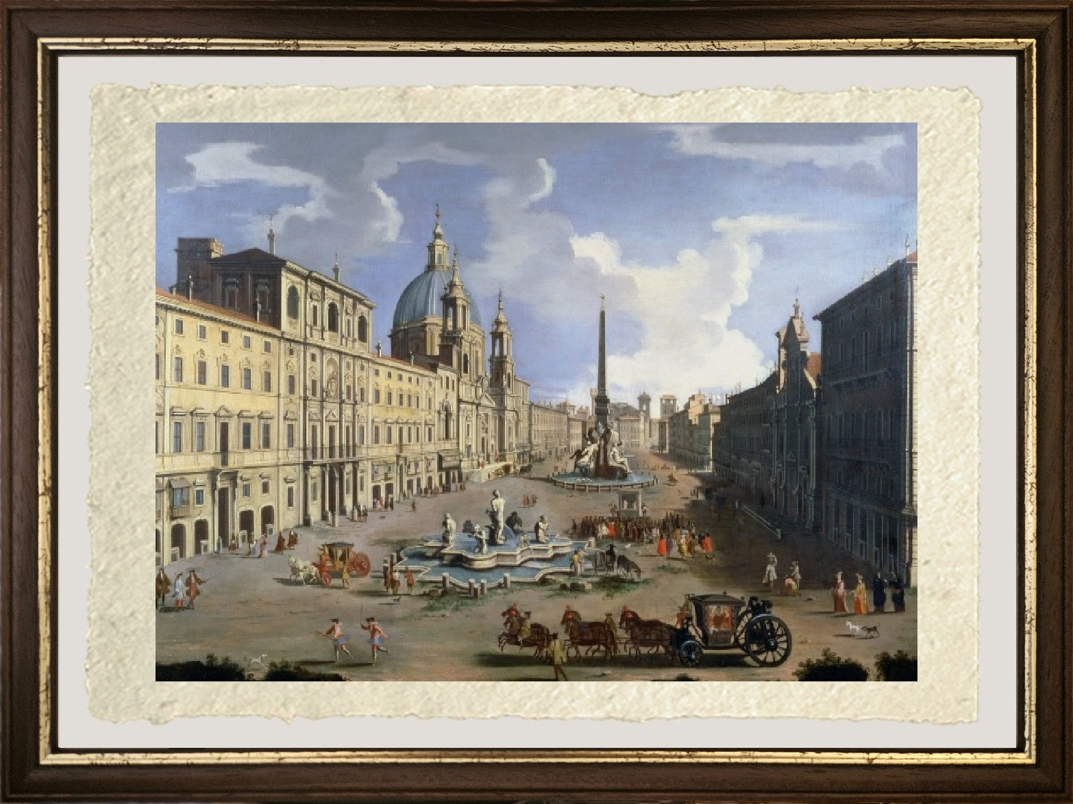 A magnificent historic view of Piazza Navona, painted by Gaspare Vanvitelli, another unforgettable corner of Rome. The obelisk is central, while a fountain is painted on the lower left. On the sides are some shops. The square is bustling with travelers, pilgrims, and ordinary residents. The buildings on the left, illuminated by the sun in a light brown-yellow ochre, while above, a beautiful blue sky, with a few gray clouds on the horizon, dominates the scene. This painting is also part of the extensive production Vanvitelli created during his stays in Rome.