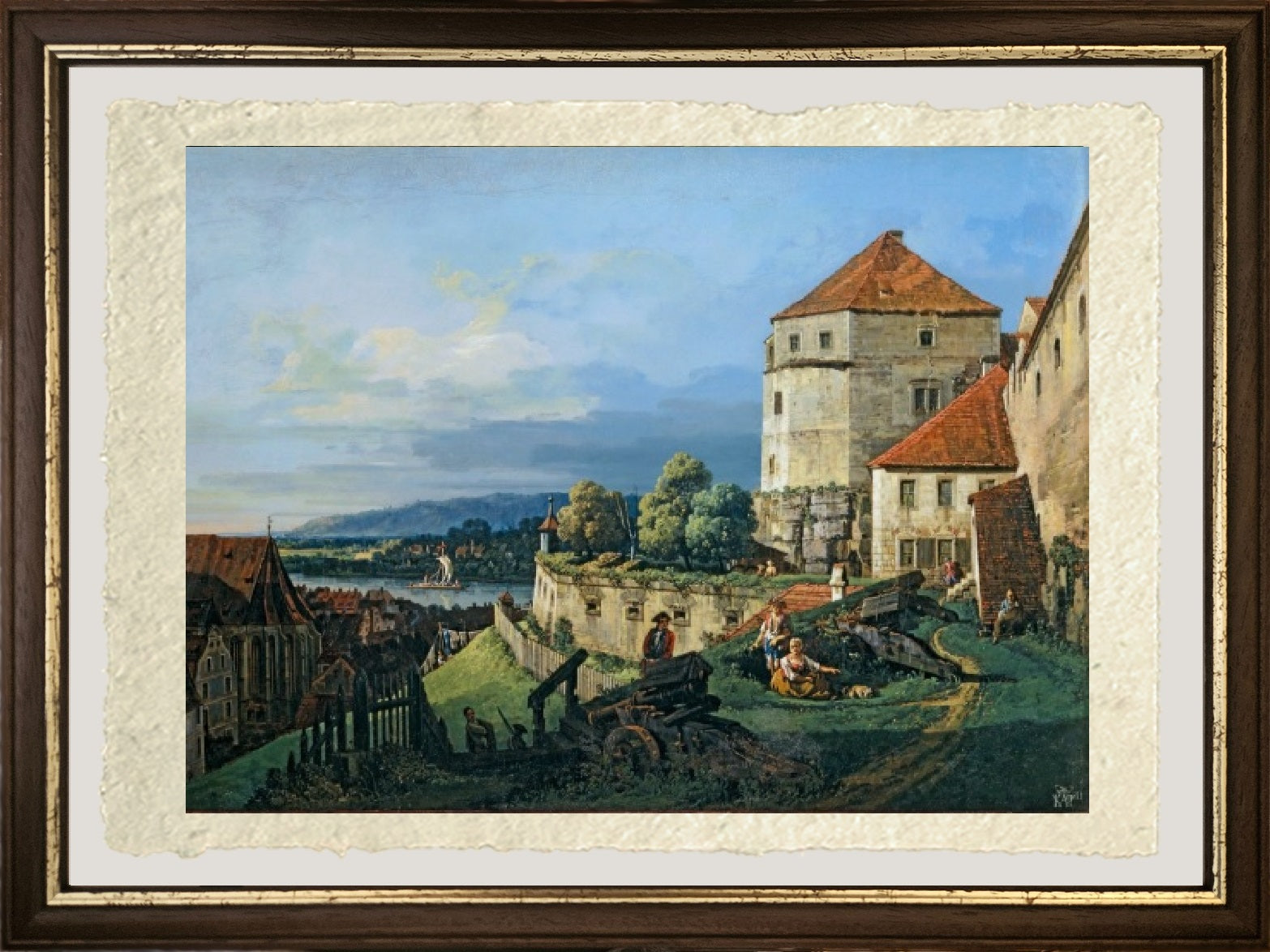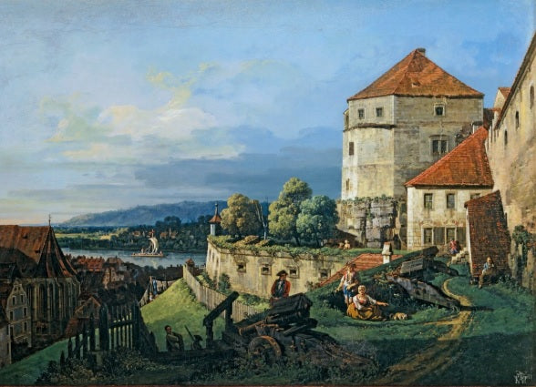 A bright and original view of the town of Pirna and Sonnenstein Castle, painted by Bernardo Bellotto. The castle, perched on a hill, stands out on the right, while the town of Pirna is further down the valley with its houses and buildings, from which the bell tower and church emerge. On the right, a large, brightly lit meadow is depicted with scenes of everyday life. The sky is clear, but there are a few clouds on the horizon. This oil on canvas painting is undated. Another version of this painting exists.
