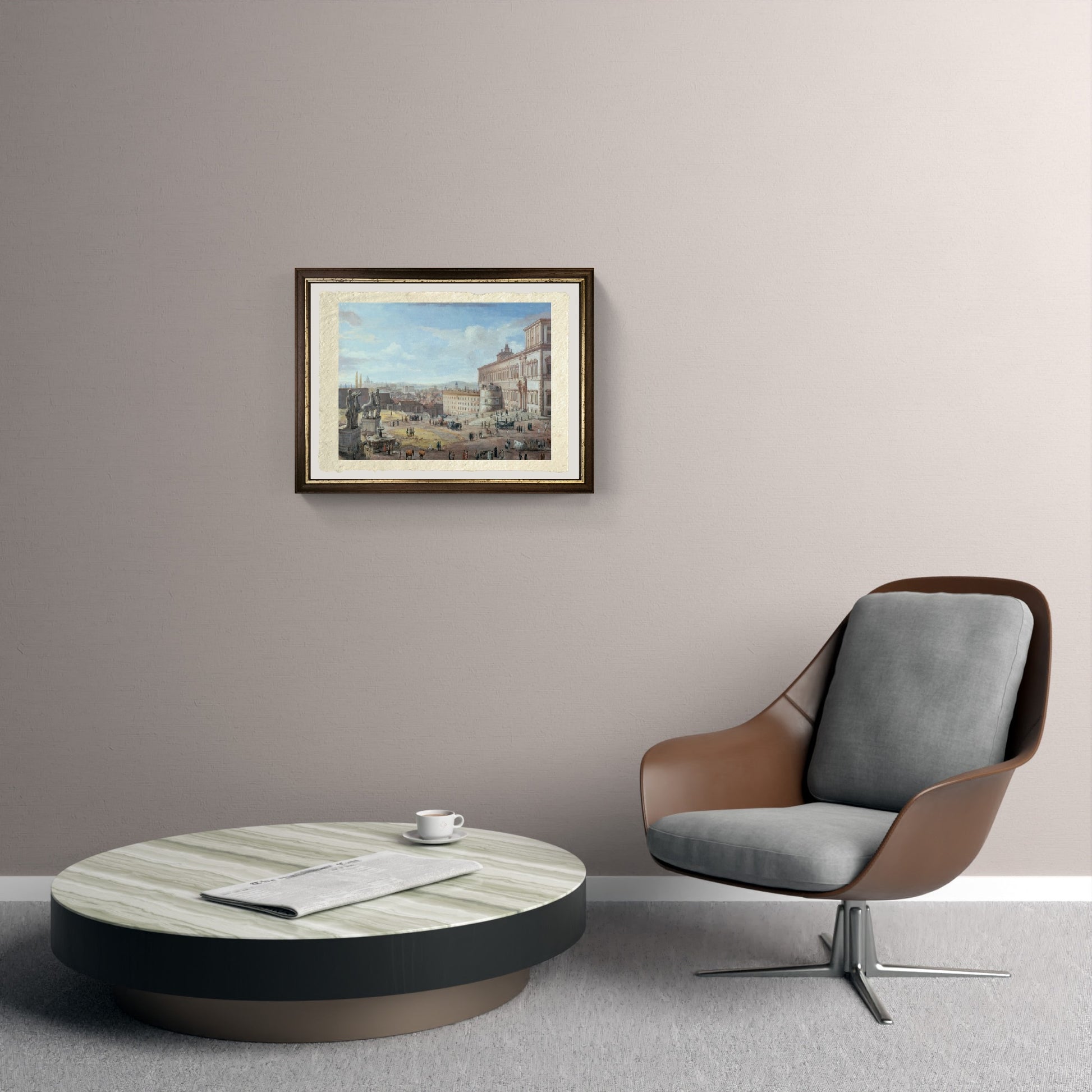 A clear and luminous historical view of the Quirinale Square in Rome, painted by Gaspare Vanvitelli. The Palace perched on the right side of the painting is prominent. The details of daily life among the Roman citizens populating the square are remarkable. A leaden sky with intense shades of blue and a few barely visible clouds looms over the scene.