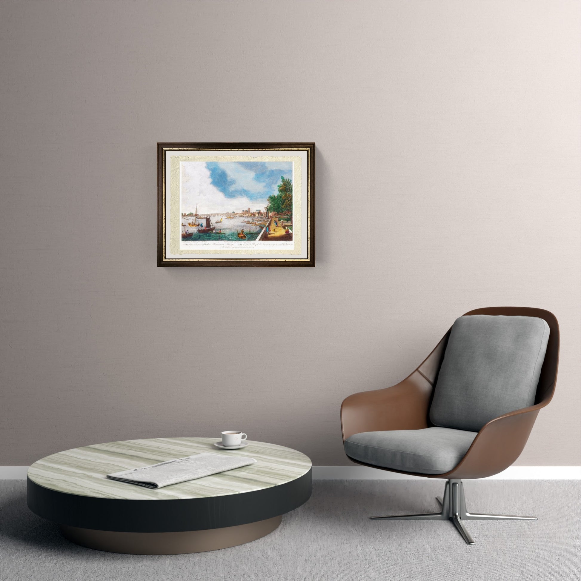 Original and luminous 18th-century view of Westminster Bridge in London, painted by Giovanni Antonio Canal, known as Canaletto. The broad river is prominent, with many boats, some on the shore, others sailing. Further in the background there is the bridge with its 15 arches connecting the two banks of the Thames. On the right there is the terrace of Somerset House, where people are strolling. In the distance, also on the right, a portion of 18th-century London can be seen. The sky features light clouds on the horizon, but the day remains clear.
