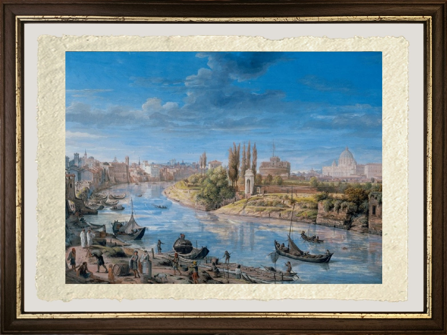 A splendid historical view of Rome in the distance by Gaspare Vanvitelli, highlighting Castel Sant'Angelo and St. Peter's on the right side of the painting. The details are blurred. The Tiber River, seemingly flowing slowly, stands out. On the left bank of the river are anchored boats and people moving about. In the center, a gateway to Rome can be seen.