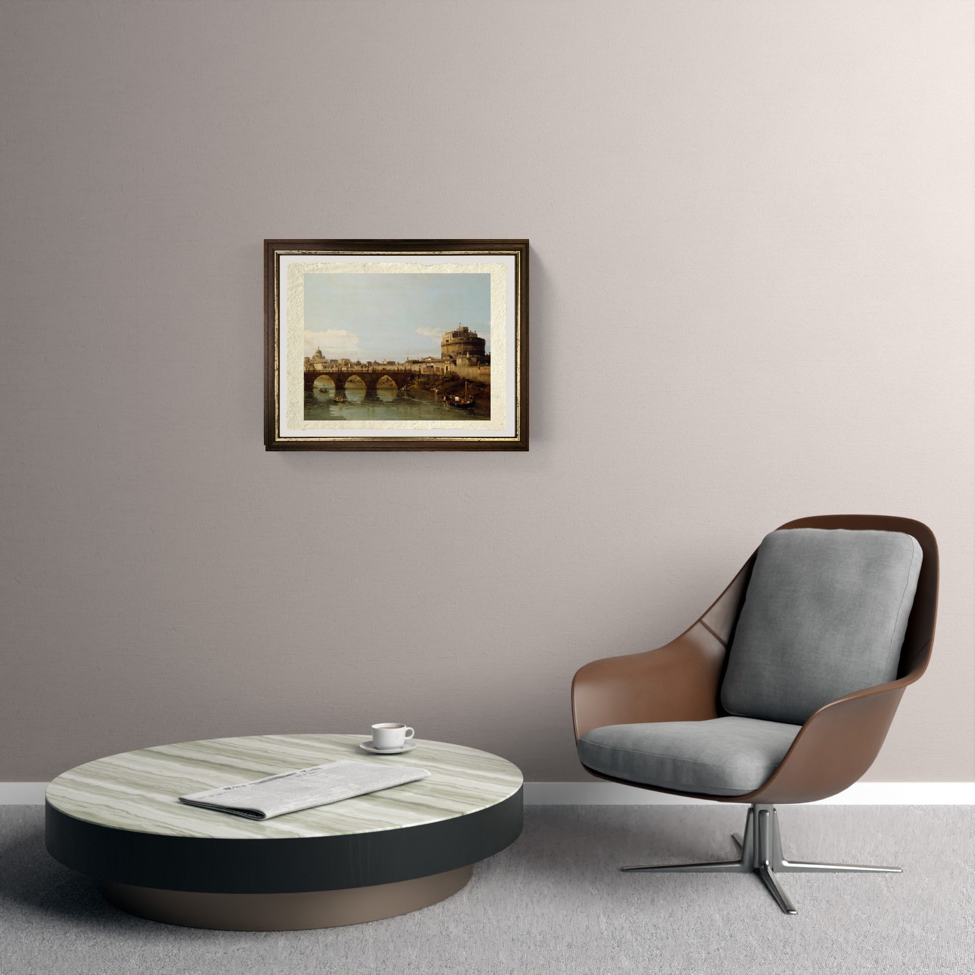 A rare and transcendent historical view of Rome, highlighted by the Castel Sant'Angelo, painted by Bernardo Bellotto. Rome is depicted in the distance, with the Tiber River seemingly flowing toward the viewer. The details are blurred, and the river is spanned by the bridge with its three Romanesque arches. Other smaller, more subtle vessels are visible near the bridge. Castel Sant'Angelo can be seen to the right of the painting, while the dome of St. Peter's is more subtle in the background. The sky is clear with a few white clouds.