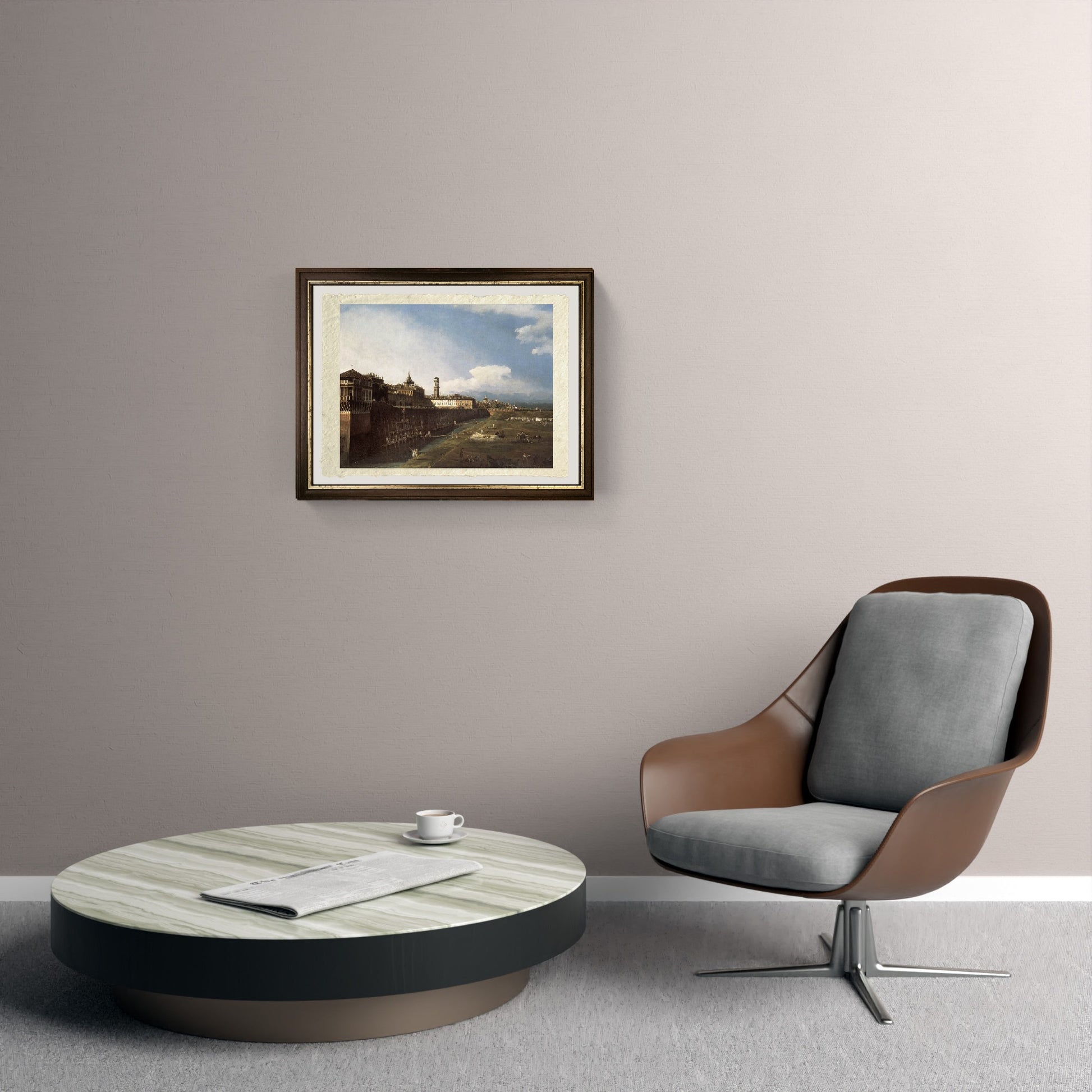 Original and rare view of the river in the city of Turin, with a view of the beautiful royal gardens, painted by Bernardo Bellotto. In the foreground there are the gardens, with their square paths traversed by the citizens of Turin. Further to the left are the square, rectangular buildings of Turin. The sky is clear, with a few white clouds on the horizon. The painting is dated 1745. Another variant of this work exists.