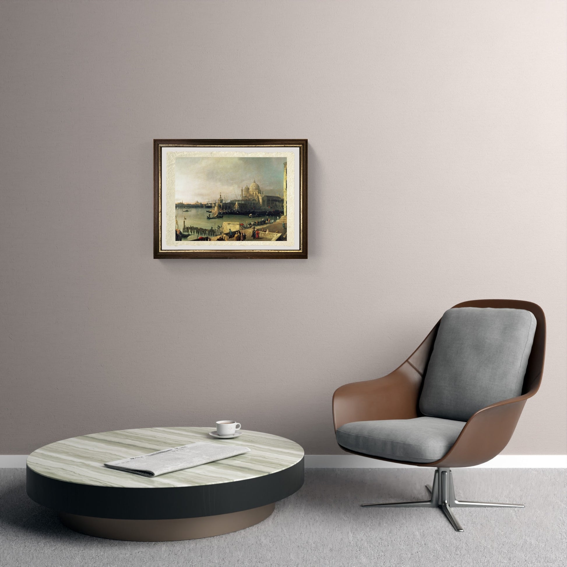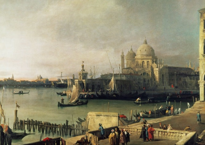 Original 18th-century view of the Church of Santa Maria della Salute and Punta Dogana from the Venice Pier, painted by Giovanni Antonio Canal, known as Canaletto. In the foreground there is the busy pier and a few anchored boats. In the Grand Canal, a few boats are maneuvering. Further in the background there is the Church of Santa Maria della Salute, illuminated by a pale morning sun. The sky is clear, but with a few clouds on the horizon. The painting, an oil on canvas, is undated. There are other variations of this work created by Canaletto.