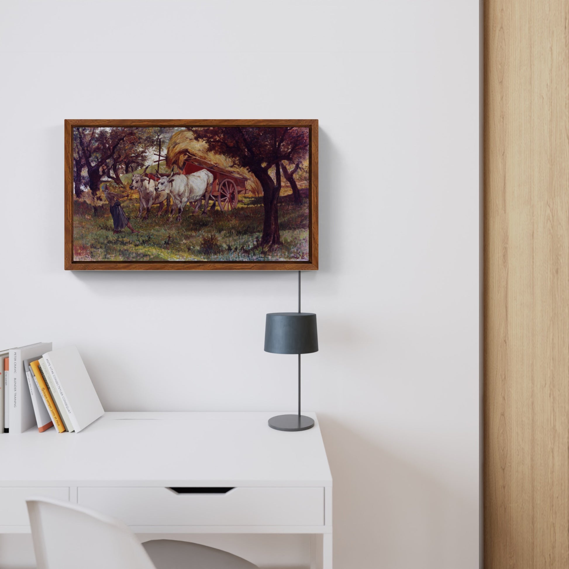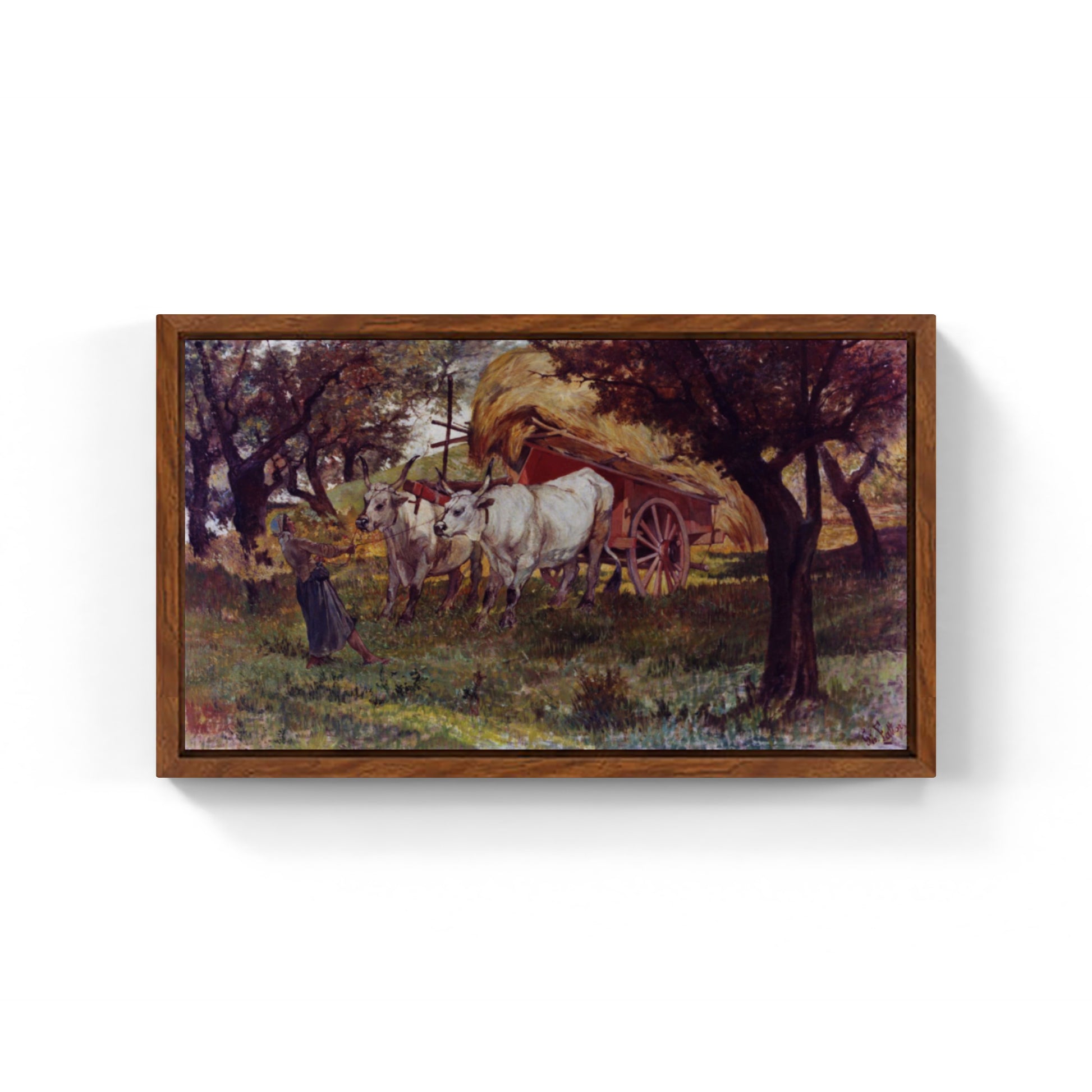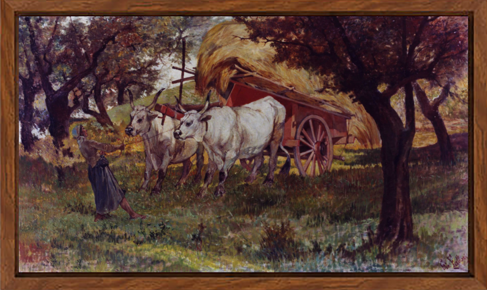 The painting shows a landscape dominated by the river that reflects the sky and the surrounding elements, with the houses of the village and its church emerging discreetly on the horizon.