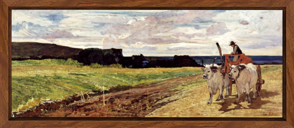 The painting shows a landscape dominated by the river that reflects the sky and the surrounding elements, with the houses of the village and its church emerging discreetly on the horizon.