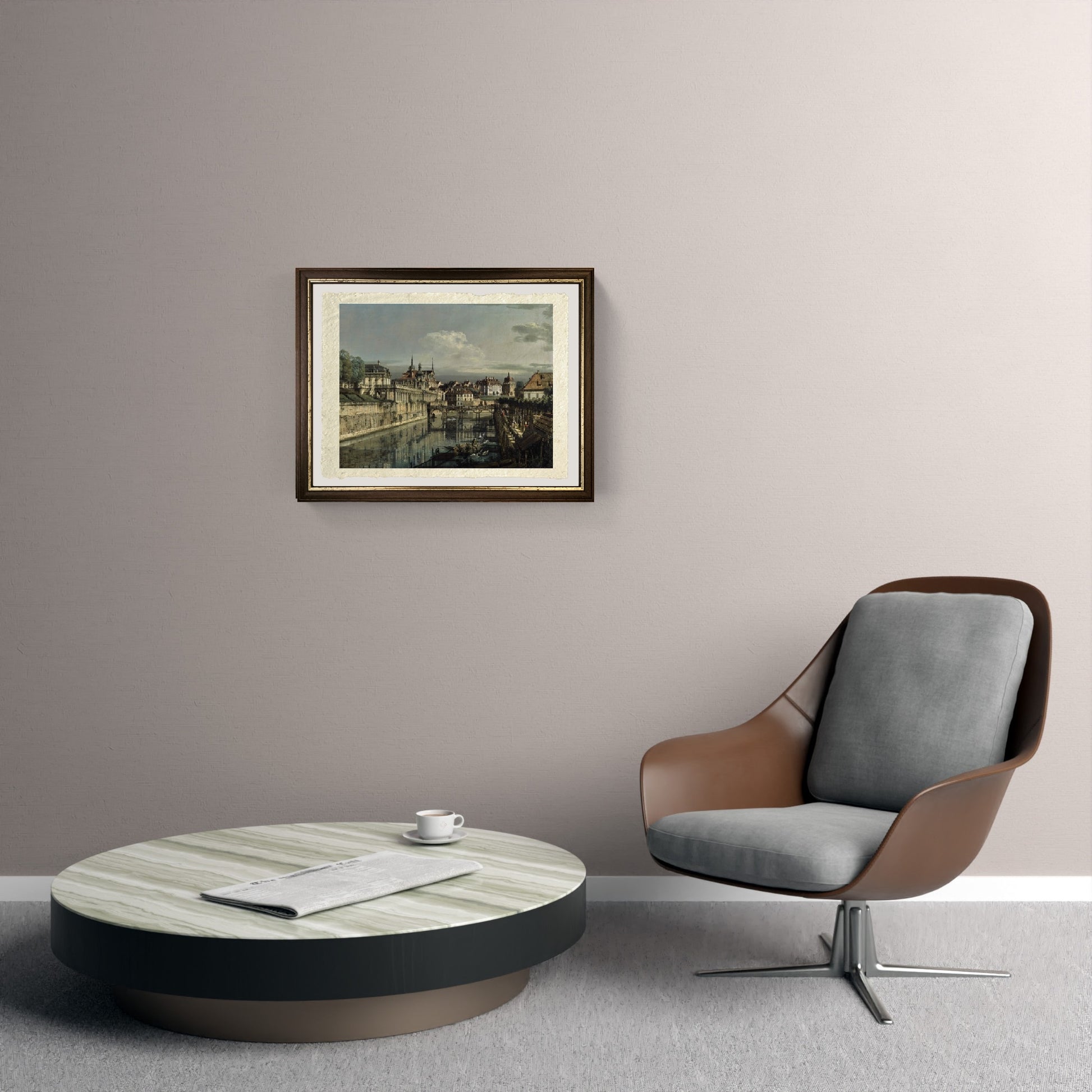Original and rare view of the old moat of the Zwinger in Dresden, painted by Bernardo Bellotto. The navigable moat is clearly visible, with high embankment walls on the left side. In the background are the buildings of Dresden, while on the right side you can see a balustrade overlooking the moat. The sky in the background features heavy clouds, while it is lighter and more nuanced in front of the viewer. The painting, an oil on canvas, is undated. It is one of 14 views of the city of Dresden that Bellotto painted during a stay there. There is another similar work with a color variation of this painting.