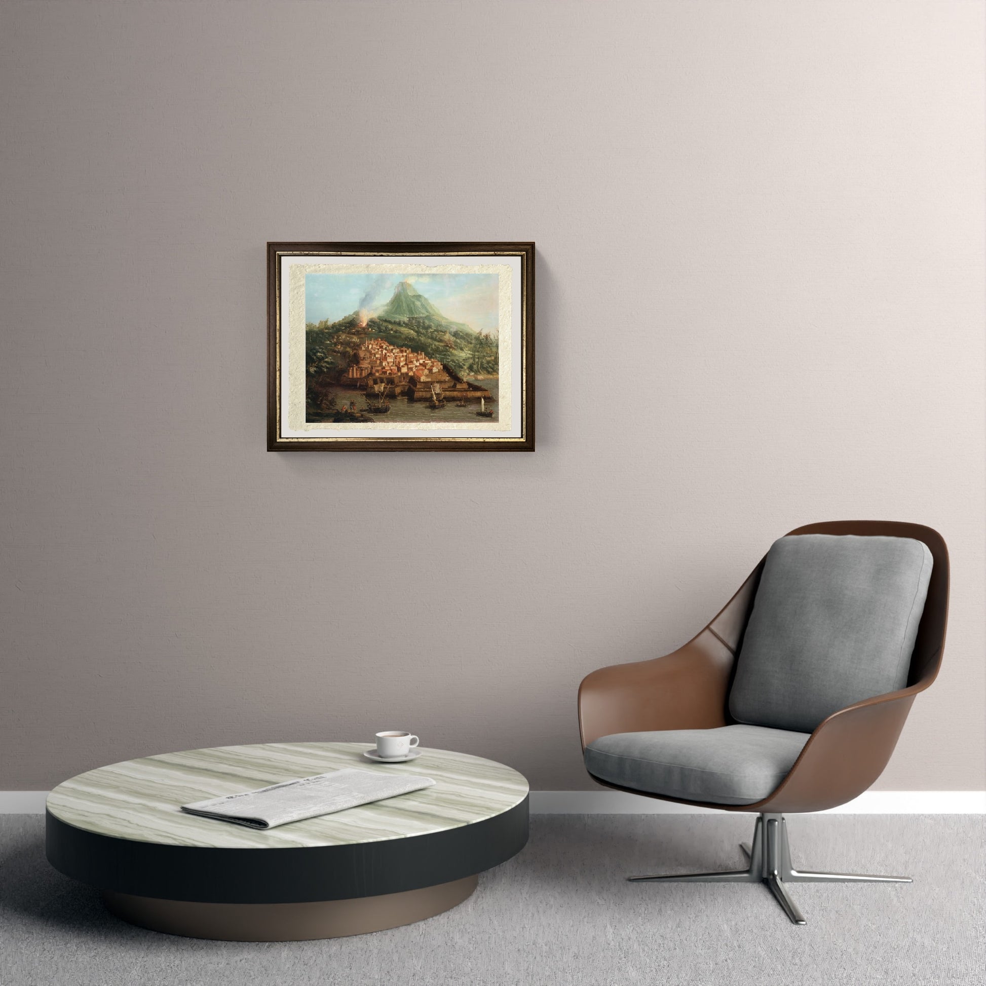 A rare and luminous original depiction of a volcanic island with a harbor, painted by Giovanni Antonio Canal, known as Canaletto. In the foreground is the volcano, with two eruptive vents, fully active. Further downstream, the city unfolds, with houses and palaces. The harbor, a docking point for several large vessels, is clearly visible. On the left there are several observers watching this unusual natural spectacle: an eruption. Canaletto was inspired by the Vesuvius or Etna, which he saw during one of his travels in southern Italy. The sky is clear, with a few white clouds on the horizon.