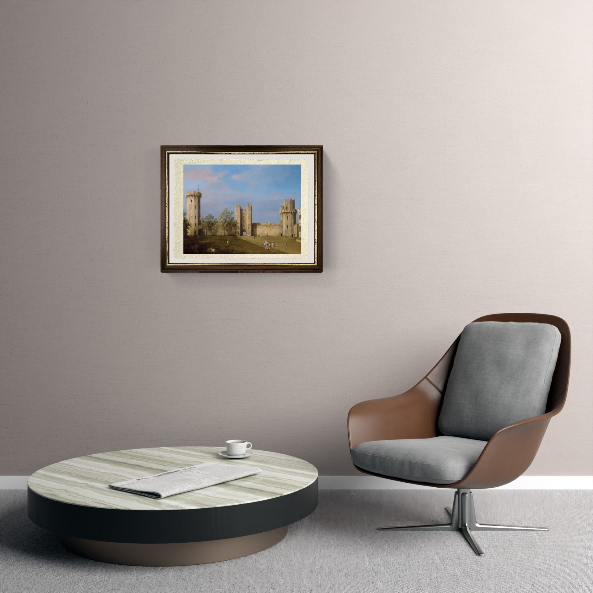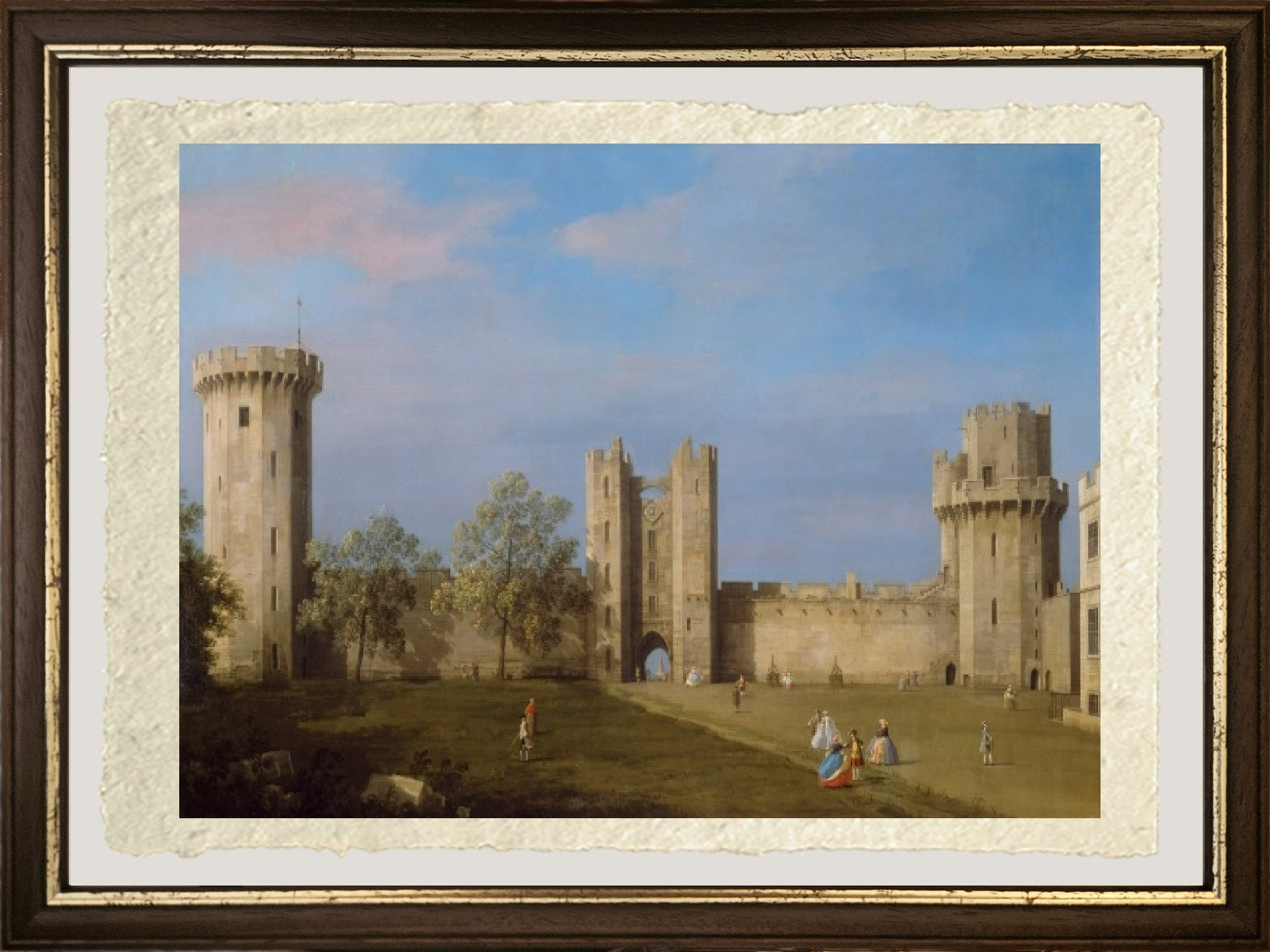 A luminous eighteenth-century view of the Warwick Castle, painted by Giovanni Antonio Canal, known as Canaletto. In the foreground there are the castle gardens, which extend at the foot of the walls, populated by a few strolling people. Further in the background there is the Anglo-Saxon-style castle, with its high crenellated walls. The sky is clear with a few white clouds on the horizon, but it's a beautiful day.