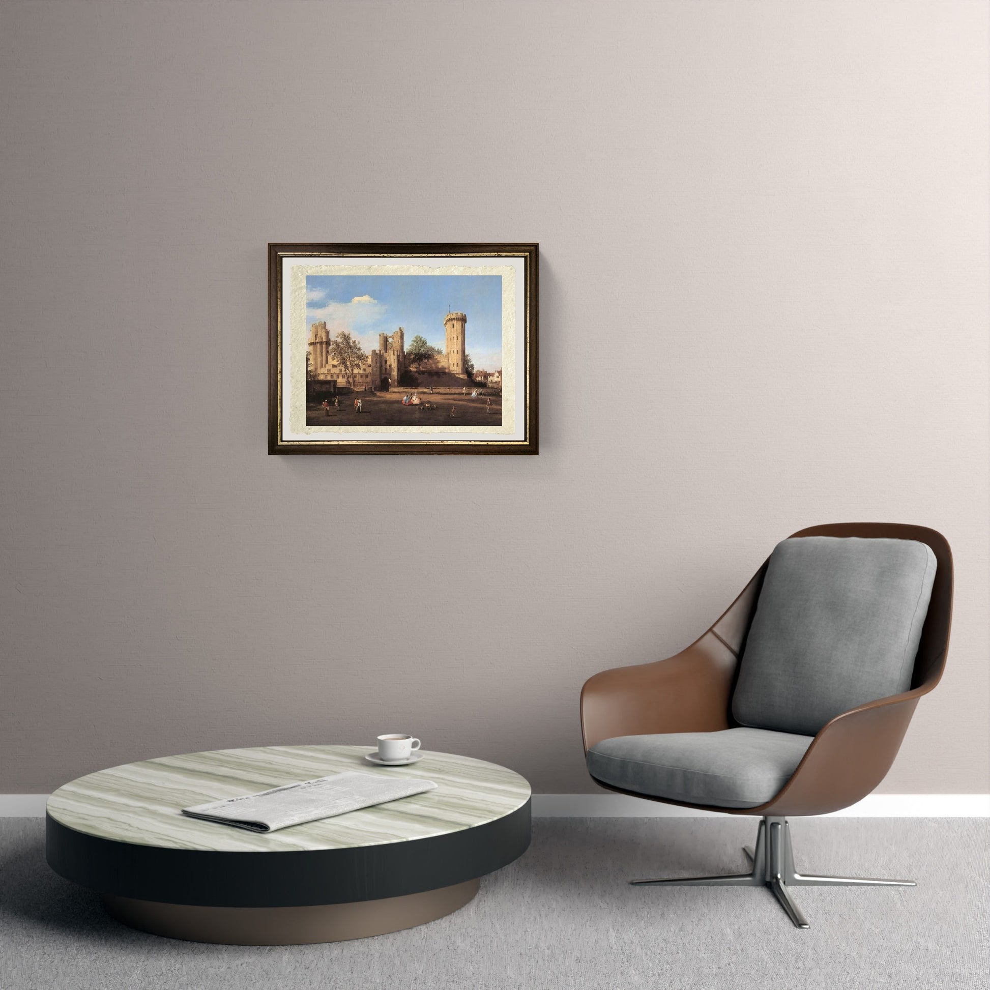 Original and luminous eighteenth-century view of Warwick Castle, painted by Giovanni Antonio Canal, known as Canaletto. In the foreground, we can see the riverbank in front of the castle walls, populated by people, with scenes of daily life. Further in the background, we find the castle, in Anglo-Saxon style, with its high crenellated walls. The sky is clear with a few white clouds on the horizon, but it's a beautiful day.