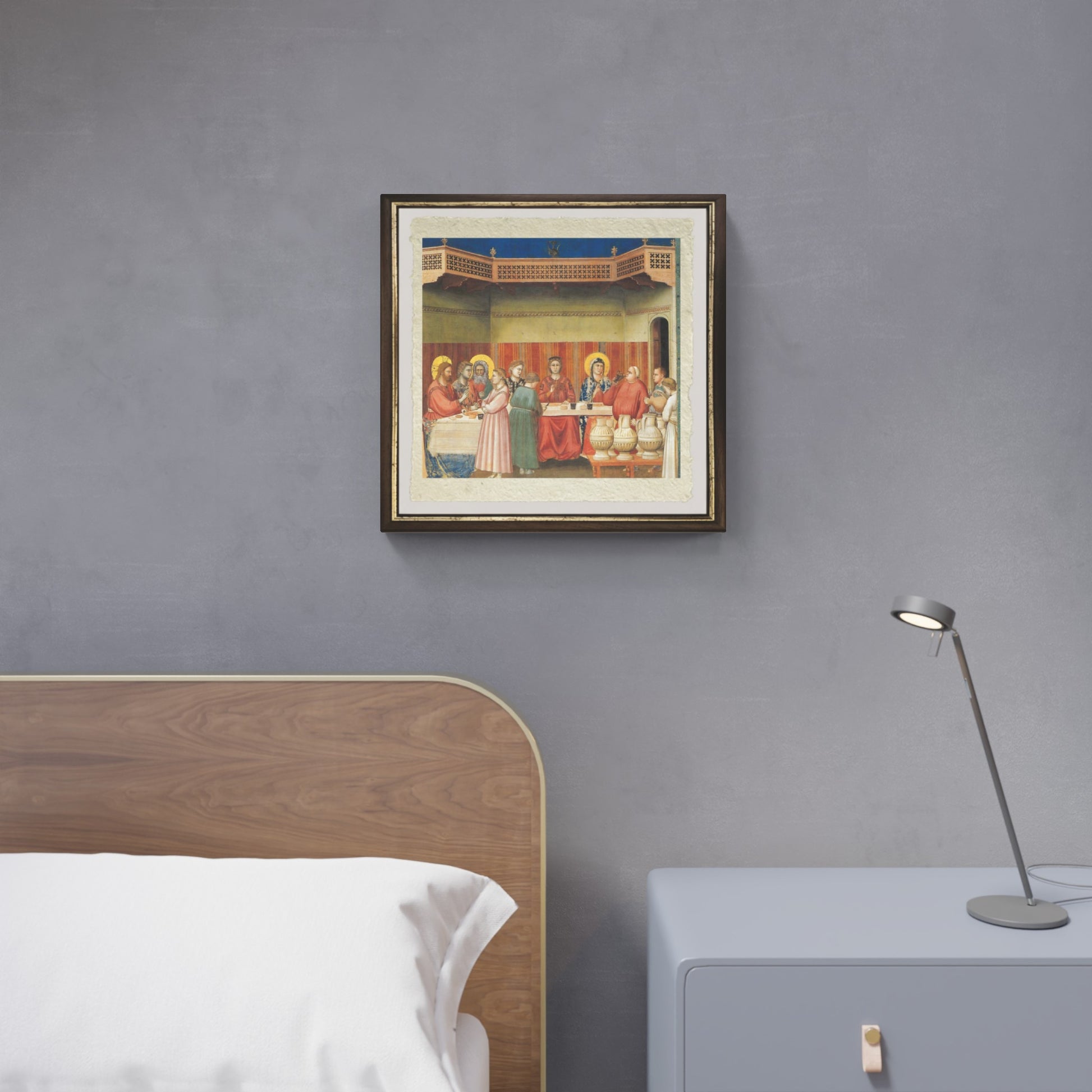 The Wedding at Cana by Giotto di Bondone, frescoed between 1303 and 1305 in the Scrovegni Chapel in Padua, depicts Christ's first miracle: the transformation of water into wine during a wedding banquet. The scene is set in an elegant room, with Jesus and the Virgin Mary seated at the center of the table, surrounded by the newlyweds and their guests. Servants in the foreground pour water into amphorae that will soon become wine, while the guests gaze in amazement at the miracle. Giotto imbues the composition with balance and vivacity, combining solemnity and everyday realism: the gestures, gazes, and arrangement of the figures create a natural narrative rhythm.