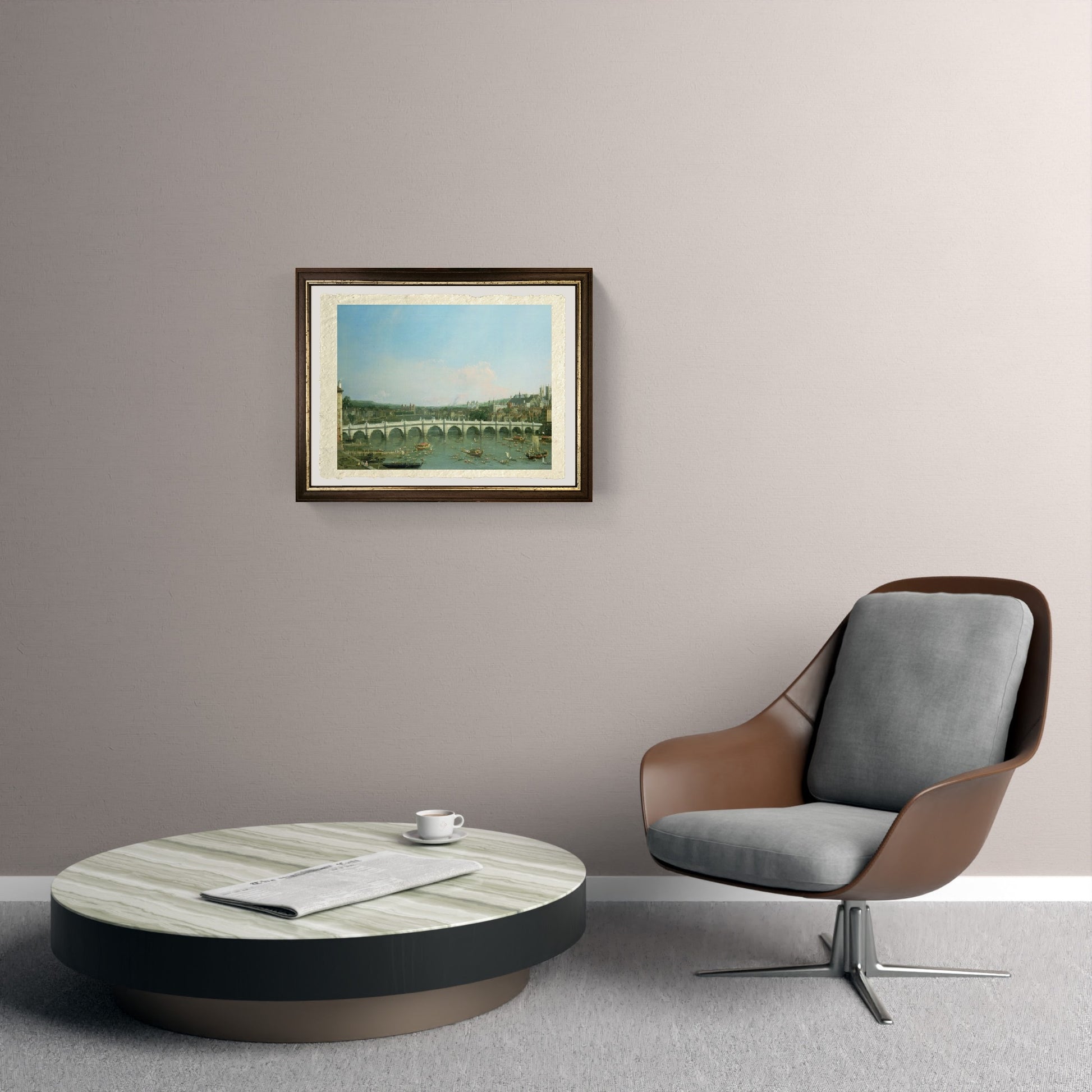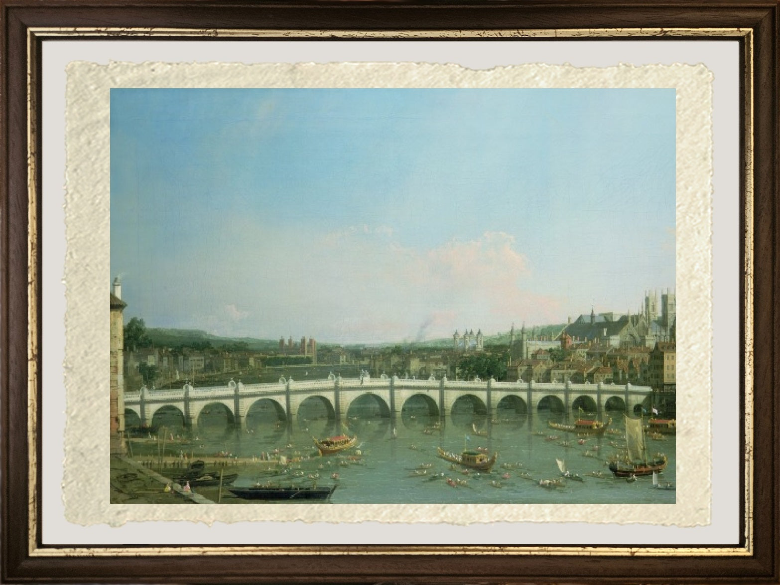 Original and luminous eighteenth-century view of Westminster Bridge in London, painted by Giovanni Antonio Canal, with Lambeth Palace in the distance. The great river of London is prominent, navigated by vessels of various types. The bridge with its 15 arches connects the two banks of the Thames, and on the right side, a portion of eighteenth-century London can be seen. The sky features light clouds on the horizon, but the day remains clear.