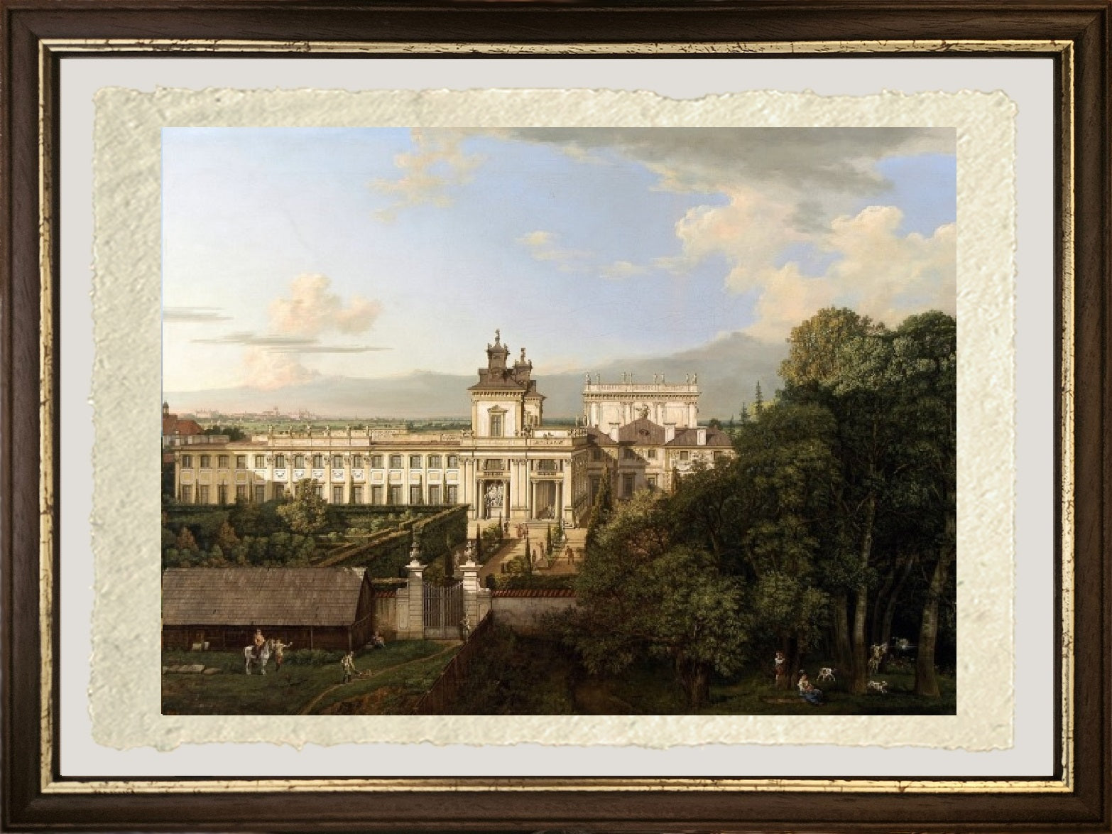Original and luminous eighteenth-century view of Wilanów Palace painted by Bernardo Bellotto. The palace is centrally located in the background of the painting, with splendid gardens in front and a detail of the entrance steps. The gardens are frequented by visitors, and the background is dominated by mountains with a clear blue sky tinged with white and a few clouds. The painting, oil on canvas, is dated 1777.
