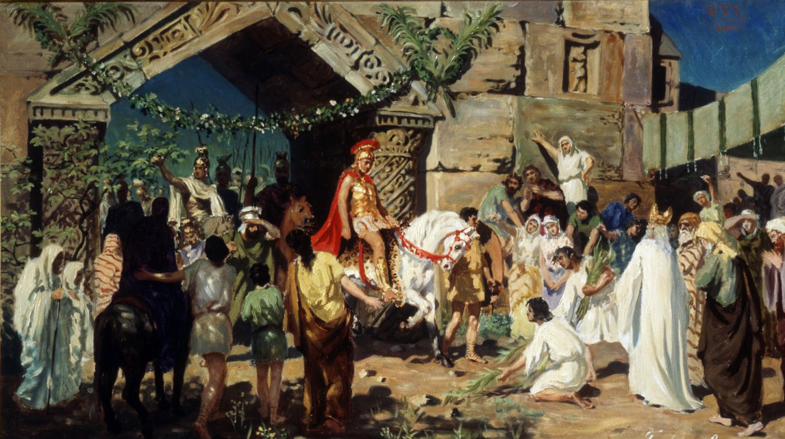 Alessandro Magno visita Gerusalemme di Stefan Bakalowicz raffigura un episodio carico di solennità e significato simbolico, in cui il grande condottiero macedone incontra la spiritualità della città sacra. La scena è costruita con un equilibrio attento tra maestosità storica e raccoglimento religioso. Alessandro, a cavallo, riconoscibile per la postura fiera ma rispettosa, si muove in uno spazio architettonico che unisce rigore classico ed elementi orientali. Attorno a lui, sacerdoti e dignitari accentuano il contrasto tra potere militare e autorità spirituale.