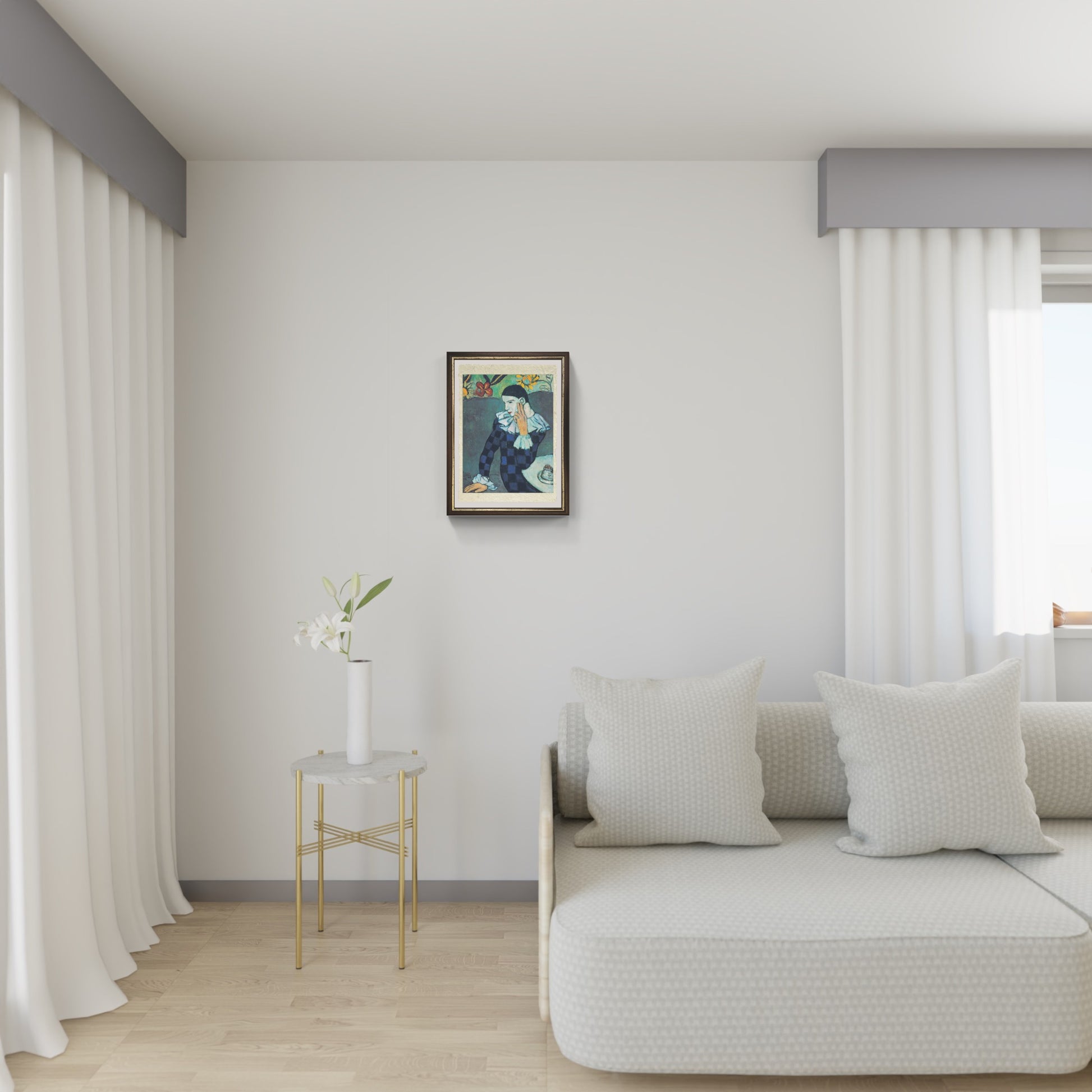 Picasso utilizza linee morbide e colori delicati per enfatizzare la solitudine e la vulnerabilità dell’artista e del personaggio rappresentato. L’opera non è solo un ritratto teatrale, ma anche una meditazione sul lato umano e emotivo, mostrando come il gioco e l’apparenza possano nascondere sentimenti profondi. Arlecchino pensoso combina quindi realismo emotivo e sensibilità poetica, esprimendo la capacità di Picasso di fondere osservazione psicologica e innovazione stilistica.