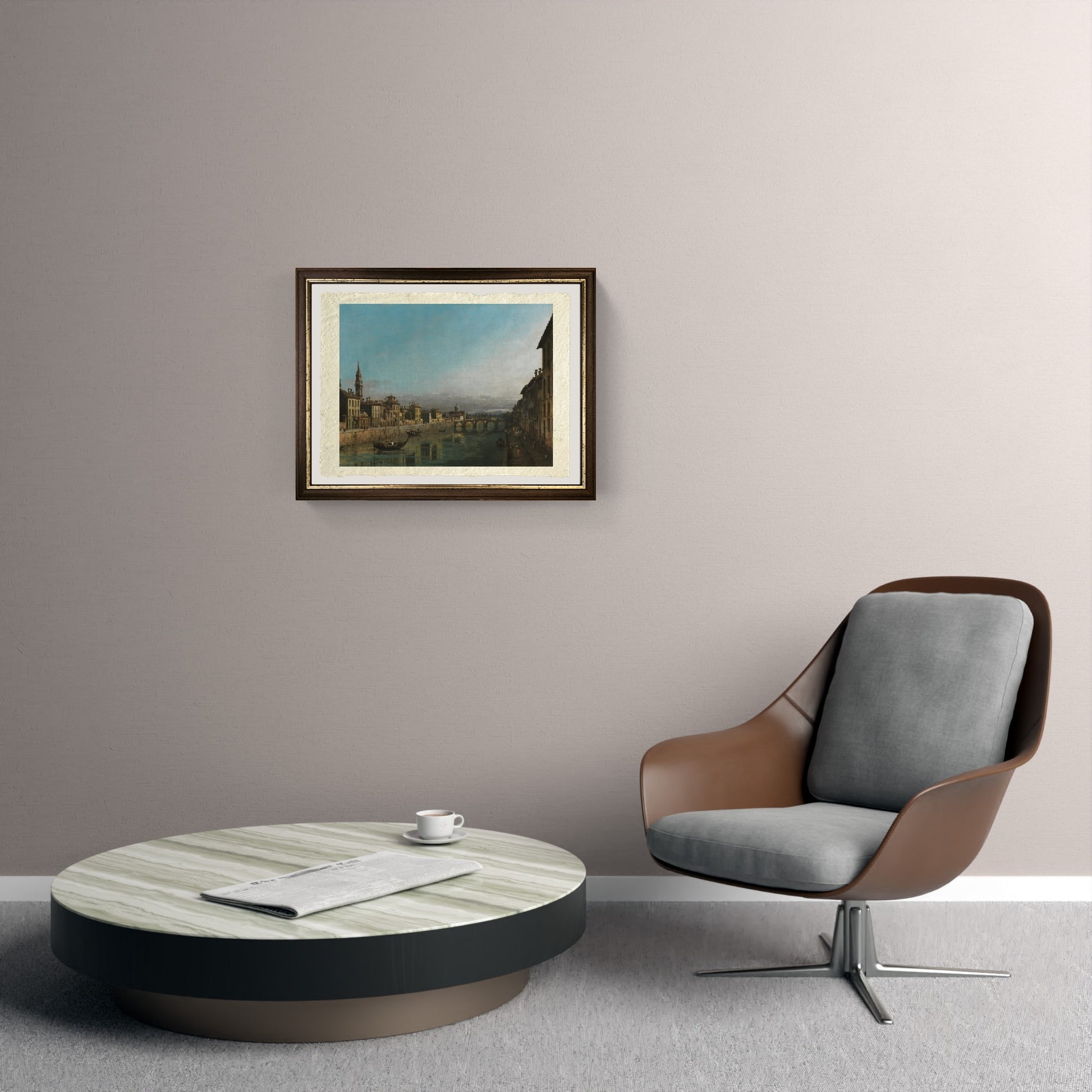 Romantica ed originale veduta del fiume Arno con ponte alla Carraia, realizzata da Bernardo Bellotto. Il fiume, solcato da alcune imbarcazioni, poste prima del ponte, domina il dipinto. Sulle due rive dell'Arno, disposti in prospettiva, vi sono i palazzi fiorentini. Sul lato sinistro è visibile l'alta mura di contenimento.