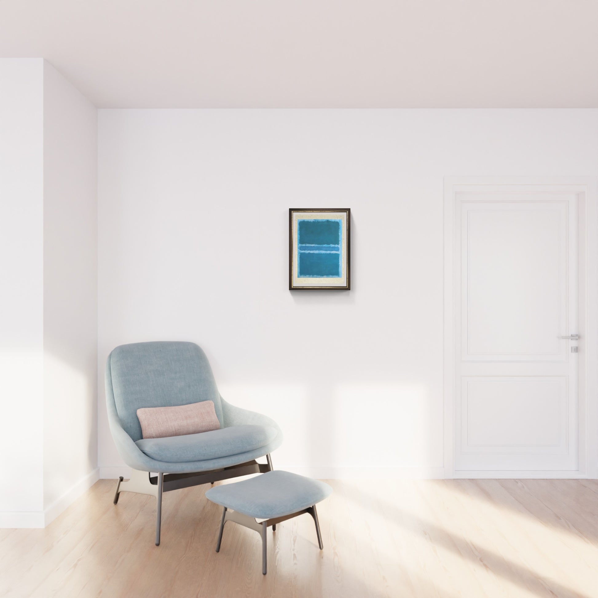 Blue Divided by Blue è un’opera emblematica della fase matura di Mark Rothko, in cui il colore diventa linguaggio emotivo e spazio contemplativo. Il dipinto presenta due grandi campiture di blu sovrapposte, separate da una sottile linea percettiva che non crea realmente divisione, ma suggerisce un delicato equilibrio tra aree cromatiche affini. Le sfumature, stratificate con velature morbide, generano una luminosità interna che sembra pulsare silenziosamente.