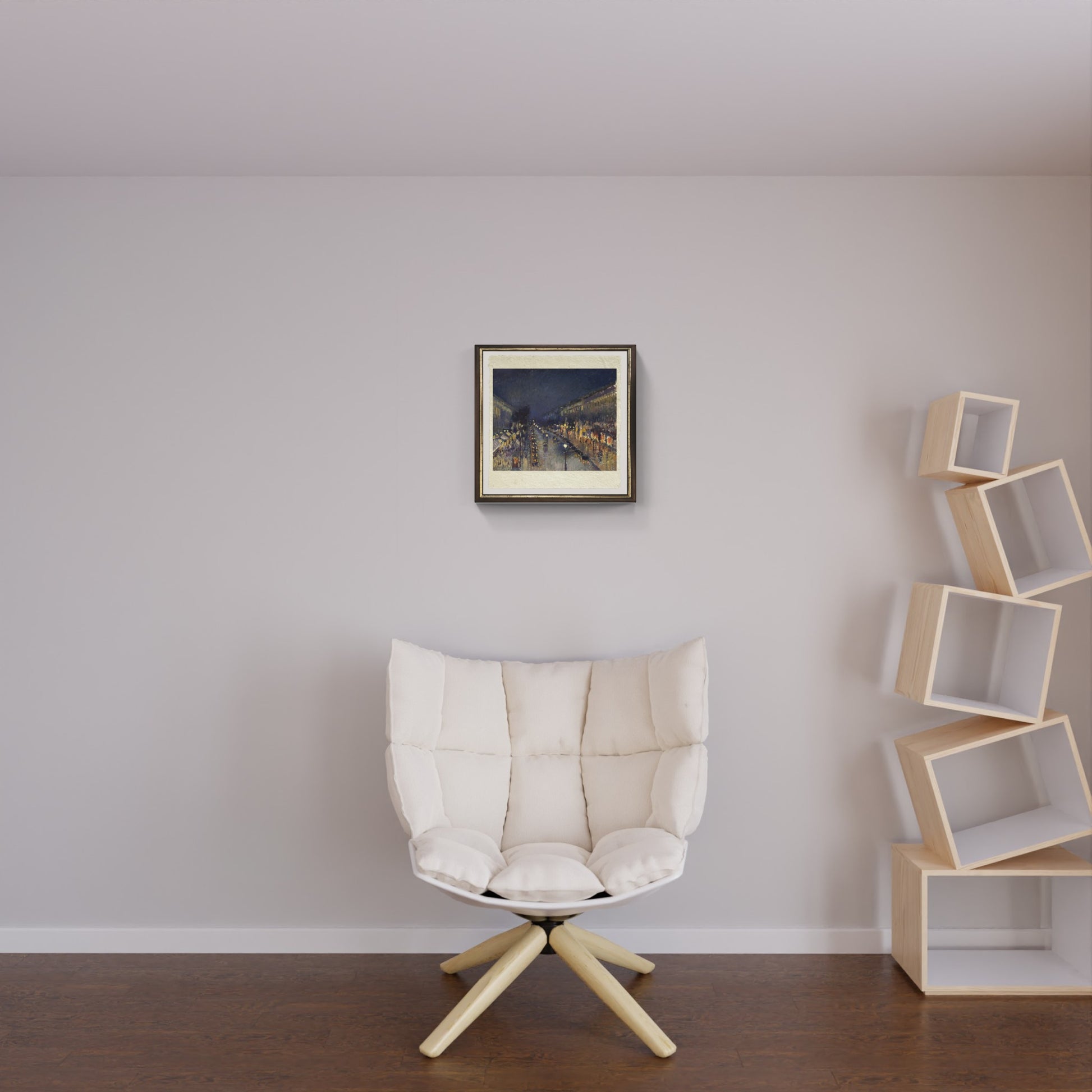 La luce gioca un ruolo fondamentale nell’opera, creando una sensazione di calore e di intimità nonostante la scena urbana. I lampioni, diffondendo una luce dorata, contrastano delicatamente con l’oscurità circostante, mentre le pennellate rapide e fluide catturano il movimento del traffico e dei pedoni, quasi come se la scena fosse in costante cambiamento. La visione della città di notte, con il cielo scuro e le ombre allungate, offre un effetto di profondità che invita lo spettatore a immergersi nell’atmosfera vibrante e misteriosa di Parigi.