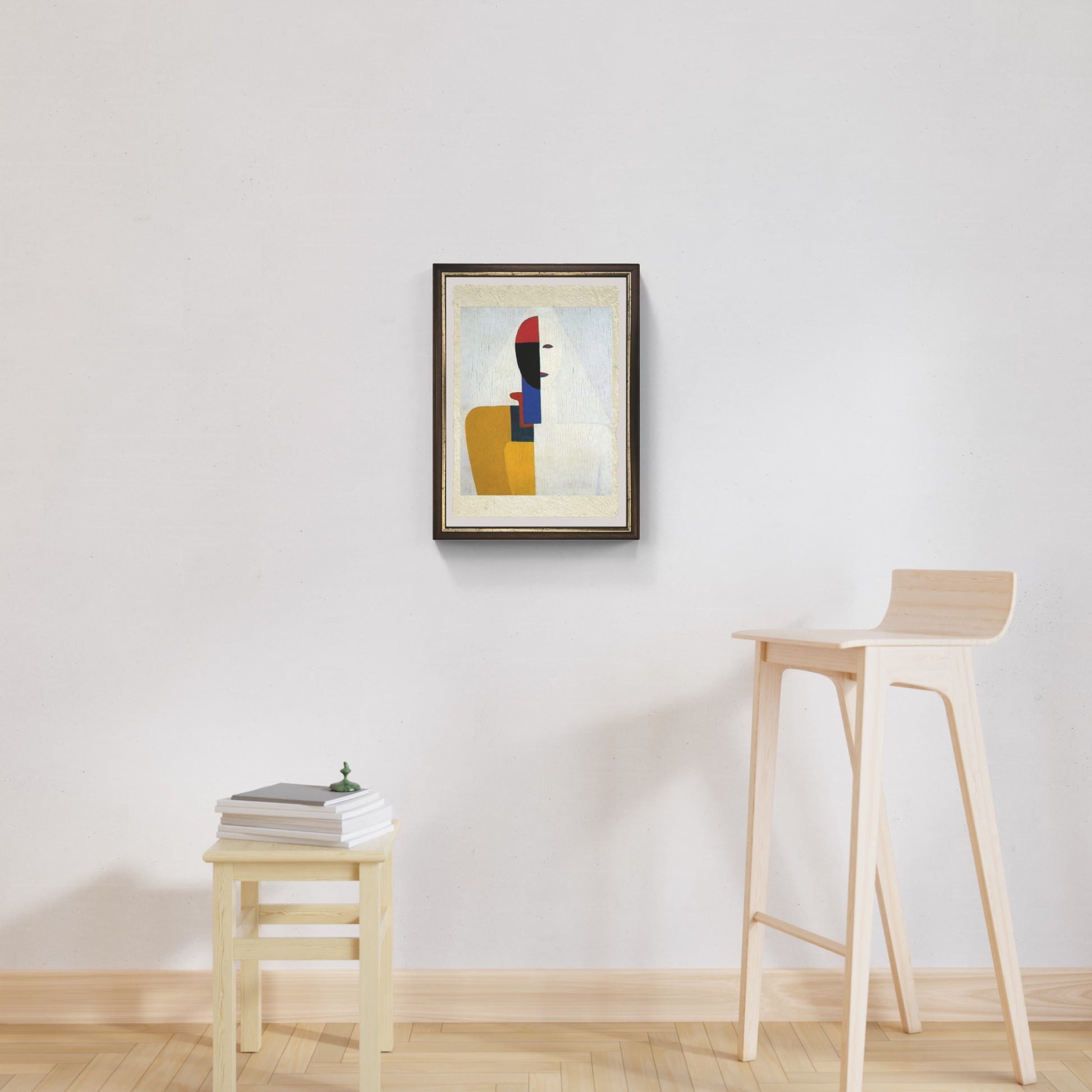 “Busto di donna” di Kazimir Malevič, realizzato intorno al 1928–1932, appartiene al periodo figurativo maturo dell’artista, successivo alle sperimentazioni suprematiste. L’opera raffigura una figura femminile a mezzo busto, caratterizzata da una costruzione volumetrica semplificata e da una forte stilizzazione dei tratti. Il volto, quasi privo di fisionomia, assume il valore di un simbolo universale più che di un ritratto realistico. Malevič utilizza una gamma cromatica intensa ma essenziale, con campiture piatte che rimandano alla sua ricerca astrattiva.