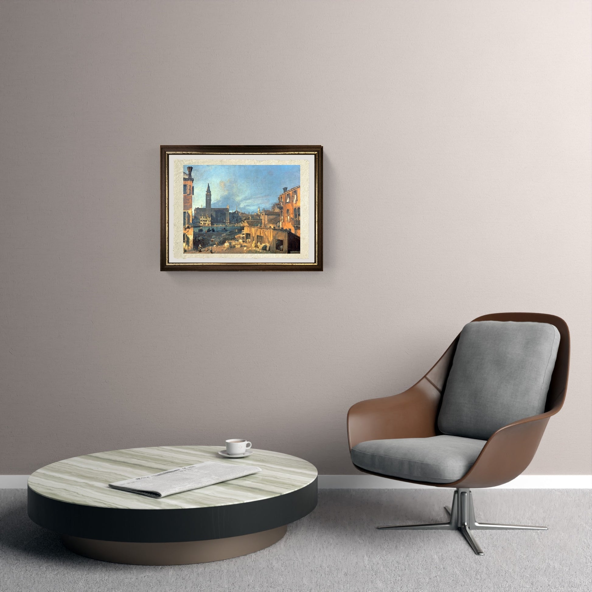Originale e rara raffigurazione settecentesca del cortile del muratore a Campo San Vidal a Venezia, realizzata da Giovanni Antonio Canal detto Canaletto. In primo piano il cortile, con scene di vita quotidiana, e delle pietre abbozzate, davanti ad una costruzione fatiscente. Più sullo sfondo il campanile ed una chiesa. La giornata vede un Sole al mattino che illumina il cortile, ma nel cielo c'è qualche nuvola minacciosa. Il quadro, un olio su tela, non è datato.
