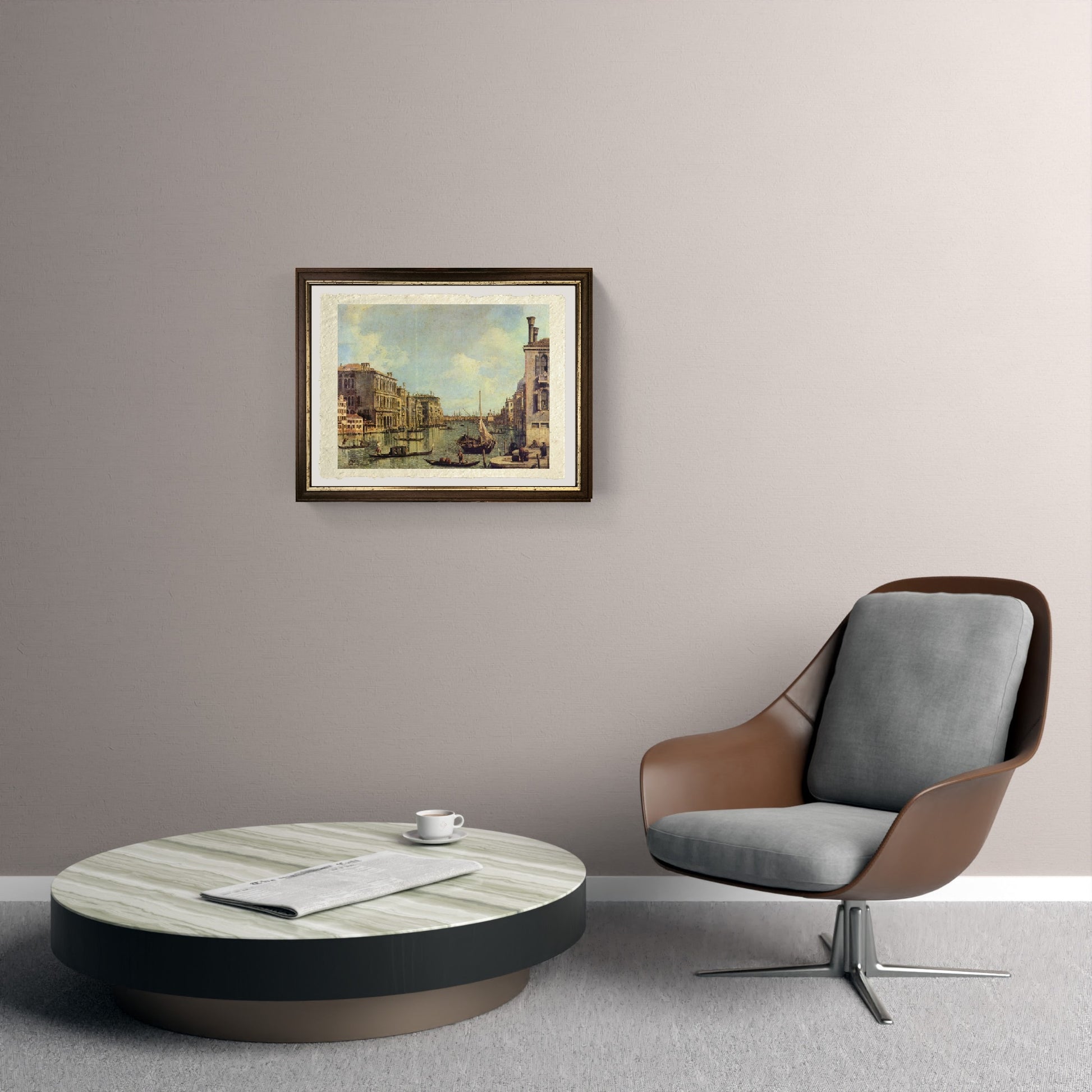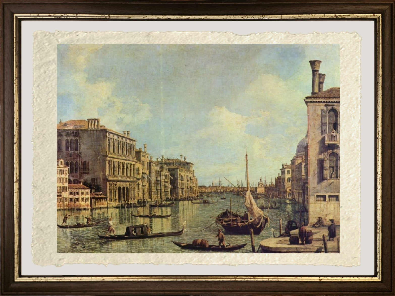 Originale e rara settecentesca veduta del Canal Grande con imbarcazioni, realizzata da Giovanni Antonio Canal detto Canaletto. In primo piano il Canal Grande, solcato da barche di varia grandezza. L'acqua è stata dipinta dal Canal con sfumature verde chiaro azzurro. Sul Canal Grande si affacciano i palazzi veneziani. Il cielo è leggermente nuvoloso, sfumato con azzurro chiaro e bianco per le nuvole. Il quadro, un olio su tela, è datato 1697. Esistono altre varianti create dal Canal di quest'opera.