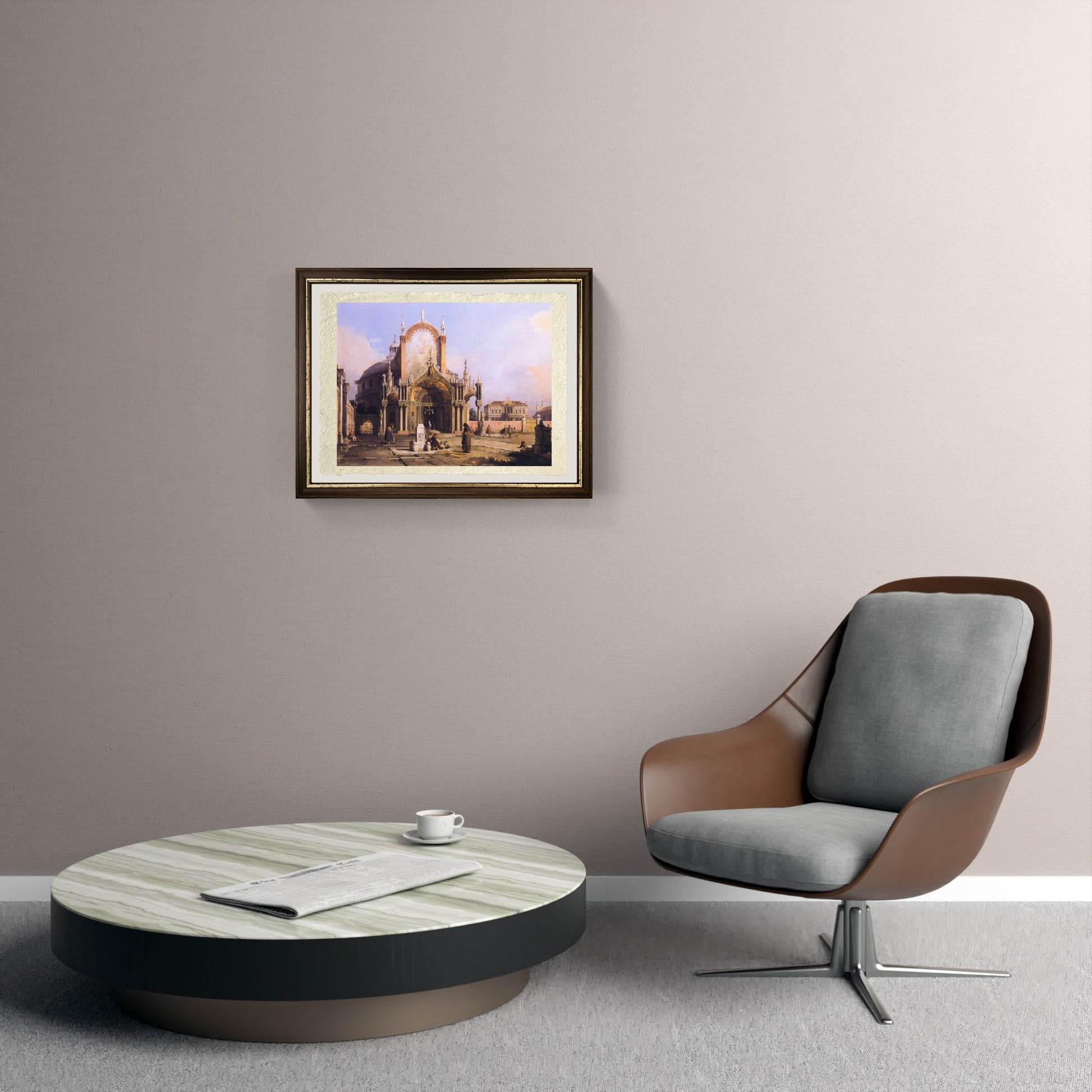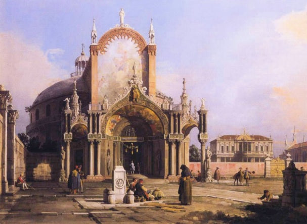 Originale e raro capriccio settecentesco di una chiesa a pianta rotonda, con antistante piazzetta, realizzata da Giovanni Antonio Canal detto Canaletto. In primo piano troviamo il ponte la chiesa, non molto grande, ma curata nei particolari, e con un pregevole dipinto sul muro frontale in alto. Più sullo sfondo troviamo dei palazzi, mentre la chiesa è circondata da delle mura. Il colore dominante del dipinto è un rosa chiaro sfumato. Il cielo è limpido, sfumato con azzurro chiaro e rosa.