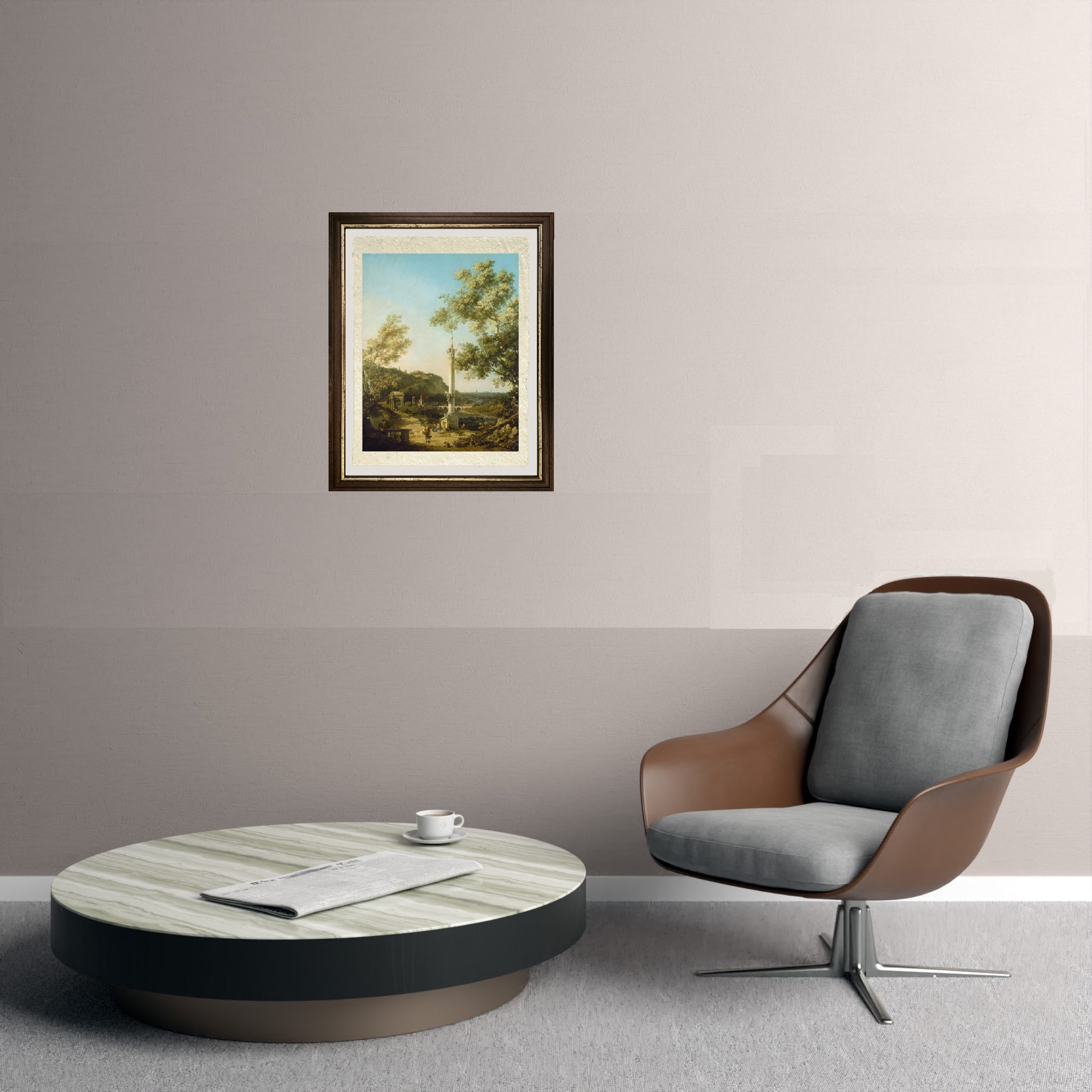 Originale e rara settecentesca veduta di un capriccio inglese raffigurante una colonna, realizzata da Giovanni Antonio Canal detto Canaletto. La colonna è posta sul lato destro di una strada, trafficata di viandanti che porta ad un borgo poco distante. Ai piedi della colonna una giovinetta, poco lontano dalla colona c'è un arco romanico, il fiume e più sullo sfondo una città. Il cielo è sereno, senza nubi all'orizzonte. Il quadro, un olio su tela, è datato 1754. Esistono altre tre varianti di quest'opera.