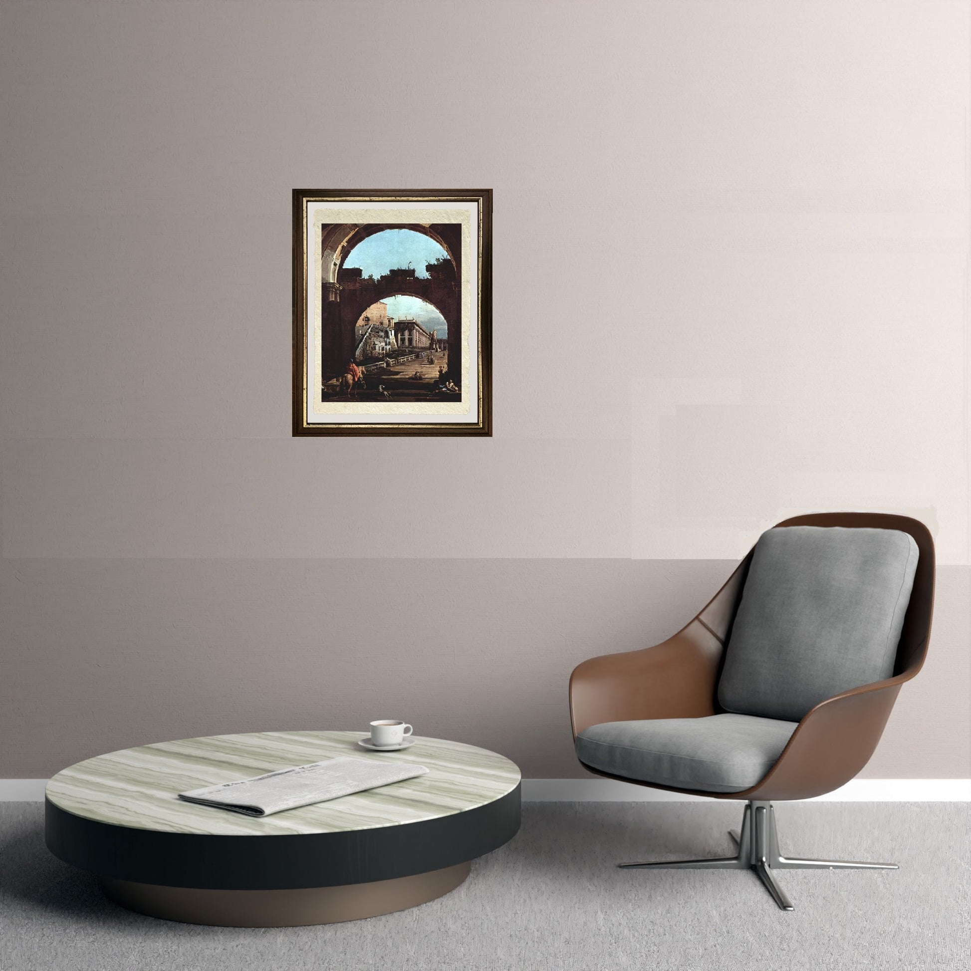 Romantica ed rara veduta di un capriccio raffigurante l'accesso al Campidoglio di Roma, realizzata da Giovanni Antonio Canal, detto Canaletto. In evidenza vi è la doppia arcata all'entrata, con dei mendicanti ai piedi delle colonne. Sulla scalinata ci sono dei cittadini che passeggiano, di cui uno a cavallo che sta varcando la porta. Infondo alla scalinata vi è una grande statua equestre, e dopo il palazzo del Campidoglio. Il cielo è sereno ma c'è qualche nuvola all'orizzonte. Sullo sfondo sono dipinti dei monti. Il quadro è datato circa 1742. Esiste un'altra variante di quest'opera con diversi colori.