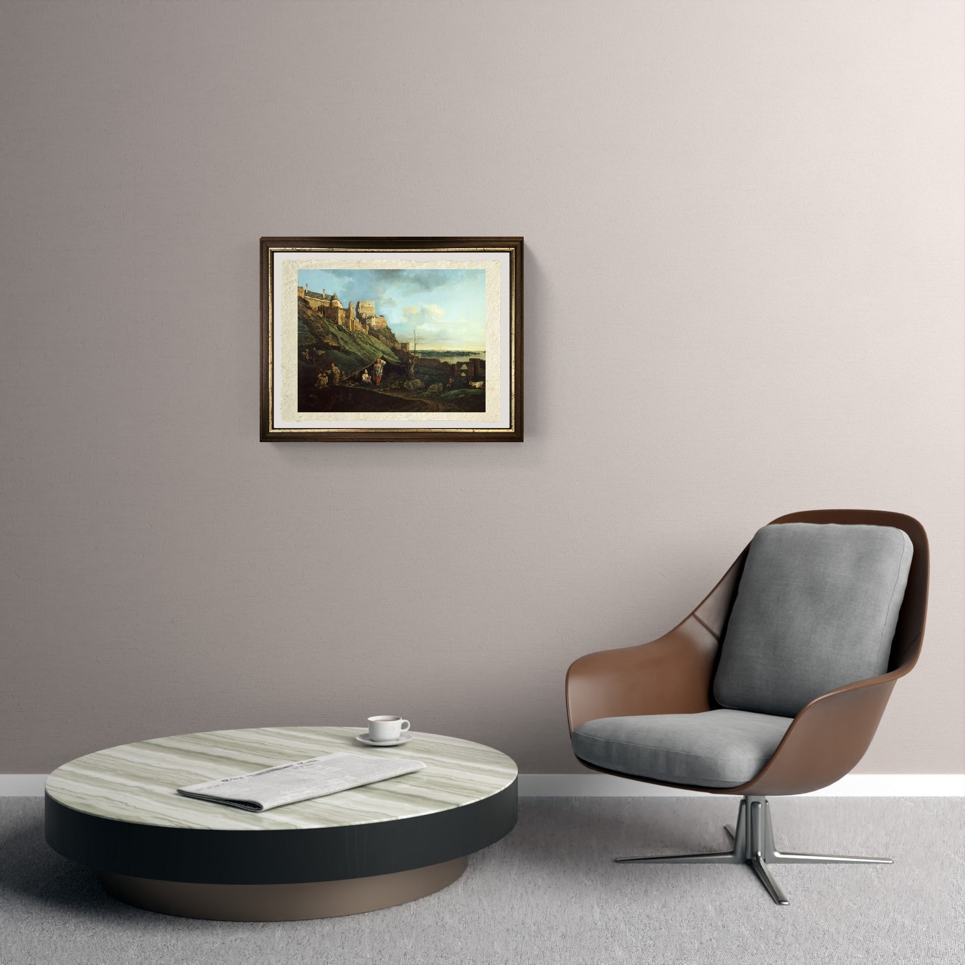 Luminosa e rara veduta del castello di Devin arroccato sulla collina, realizzata da Bernardo Bellotto. Il castello, dall'alto, domina tutto il paesaggio, con le sue alte mura sembra inespugnabile. Più in primo piano vi sono scene di vita quotidiana su un ambiente rurale. Particolare del dipinto l'effetto luce di un sole al mattino, che da al castello una luce particolare.