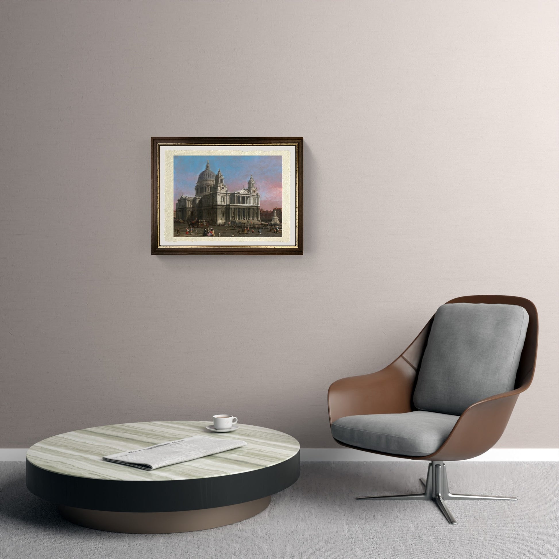 Originale e luminosa rappresentazione settecentesca della cattedrale di San Paolo a Roma, realizzata da Giovanni Antonio Canal detto Canaletto. In primo piano troviamo la grande chiesa con un colonnato disposto a due livelli, il doppio campanile, e la grande cupola centrale. Nella piazzetta antistante la chiesa vi sono scene di vita quotidiana. Il cielo è sereno, ma c'è qualche nuvola rosa carico sull'orizzonte.