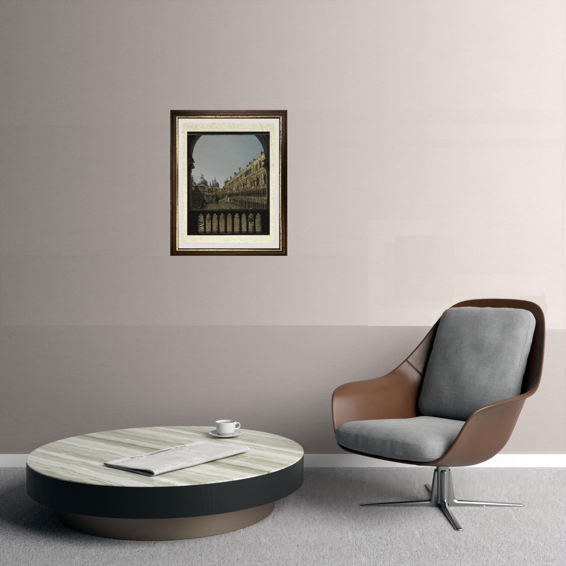 Originale e raro settecentesco dipinto con vista dal Palazzo Ducale della corte interna, realizzato da Giovanni Antonio Canal detto Canaletto. In primo piano la sagoma della finestra da dove sta guardando l'osservatore. Ai suoi occhi si apre una porzione della corte, il Canaletto dipinge con molti particolare il palazzo di lato alla corte, mentre sullo sfondo vi sono le cupole di San Marco. Il cielo non ha nuvole, il quadro, un olio su tela, non è datato.