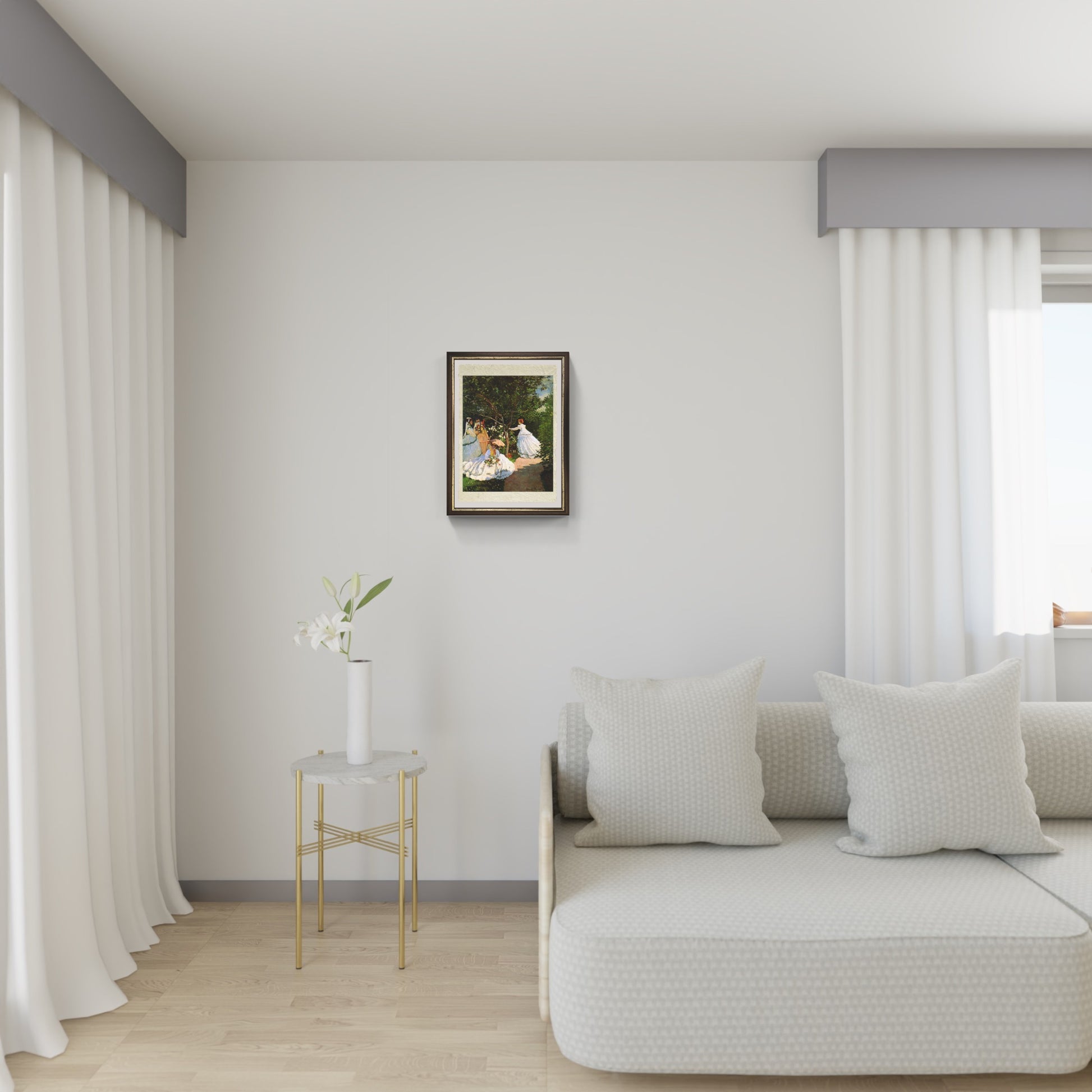 Il quadro raffigura quattro figure femminili elegantemente vestite, probabilmente membri della famiglia o conoscenti dell'artista, che passeggiano o si riposano in un giardino assolato. Monet utilizza la sua maestria nel rendere la luce e le sue variazioni: i giochi di ombre e riflessi sui tessuti, la brillantezza dei petali dei fiori e la profondità del fogliame creano un'immagine vibrante e quasi palpabile.