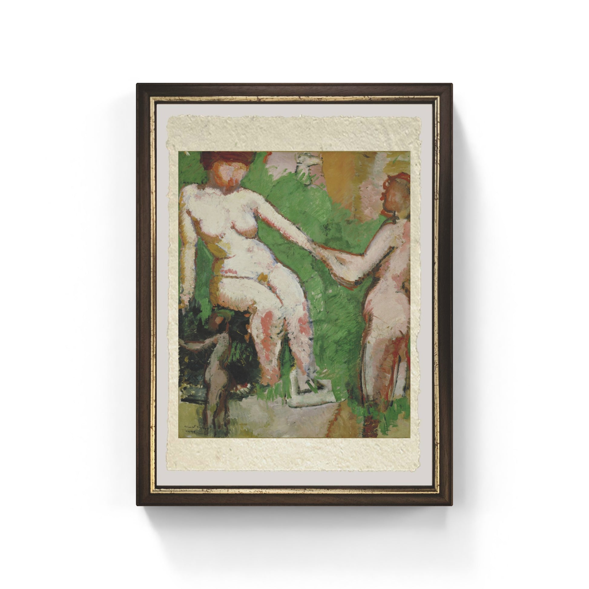 Il fondo verde acceso, trattato con ampie stesure di colore, contribuisce a un’atmosfera vibrante e quasi primitiva, mentre l’assenza di dettagli naturalistici concentra l’attenzione sulla relazione tra i corpi. L’opera rivela l’influenza delle avanguardie francesi, ma anche un interesse personale di Duchamp per la deformazione espressiva, anticipando le sue future sperimentazioni.