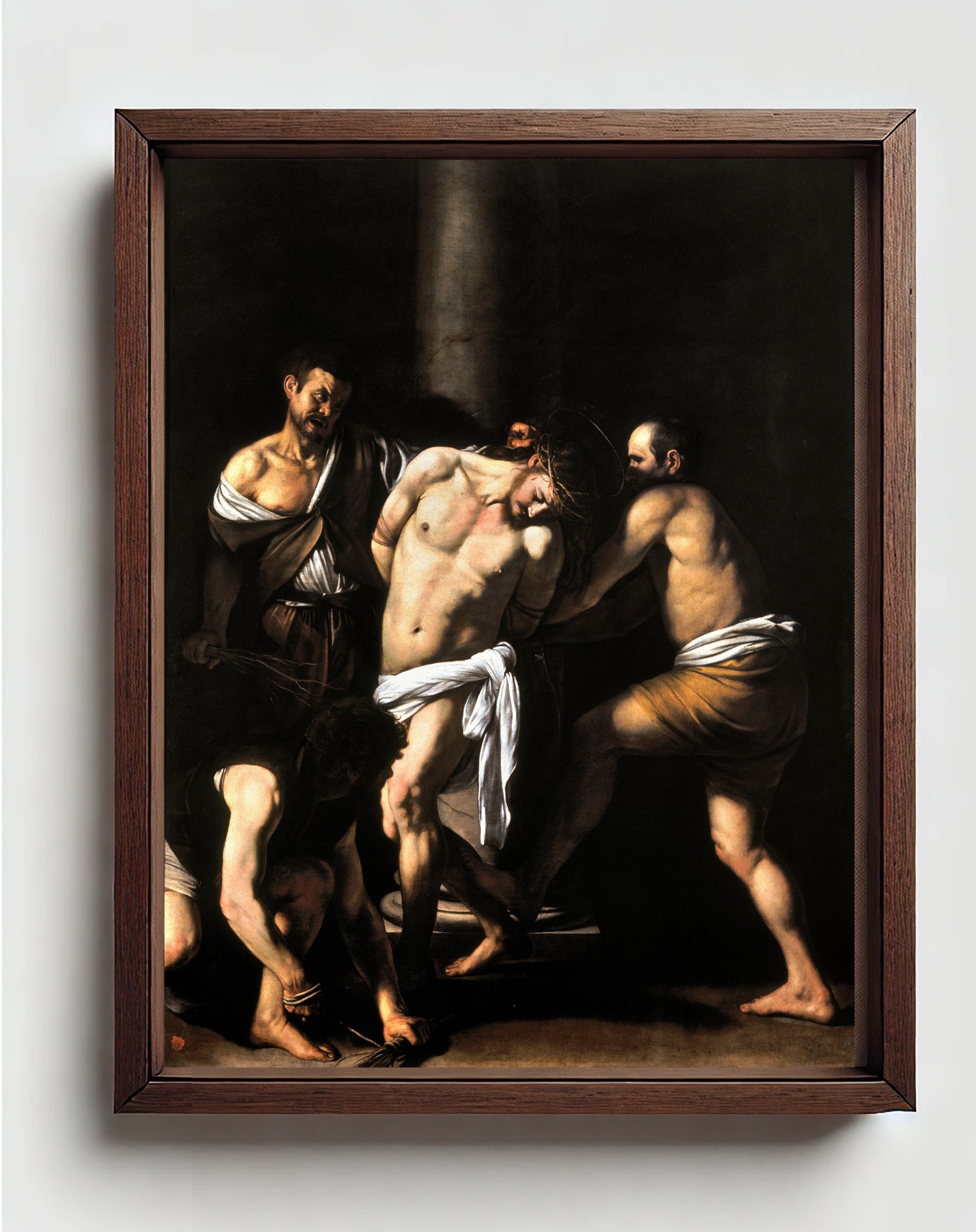 Caravaggio utilizza il chiaroscuro per accentuare la drammaticità della scena. La luce, proveniente da una fonte esterna, illumina solo il corpo di Cristo, creando un forte contrasto con l'oscurità circostante. Questo stile enfatizza la brutalità e la violenza del supplizio.