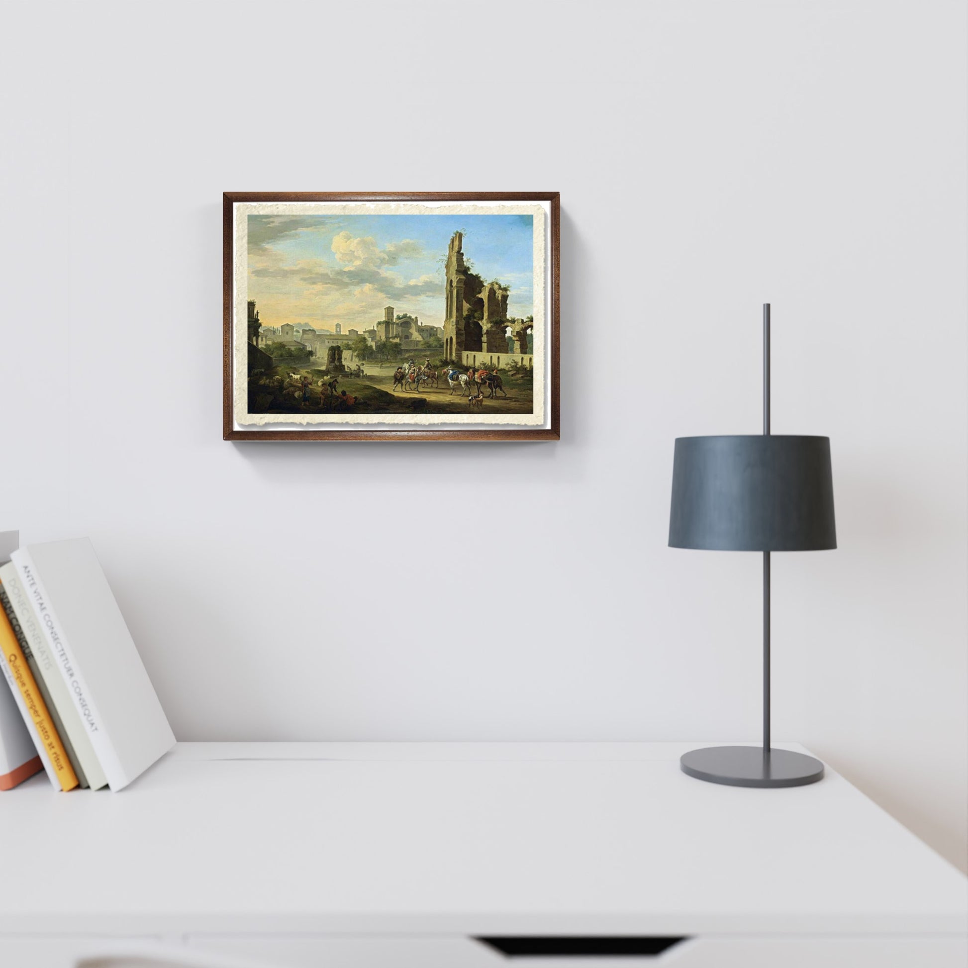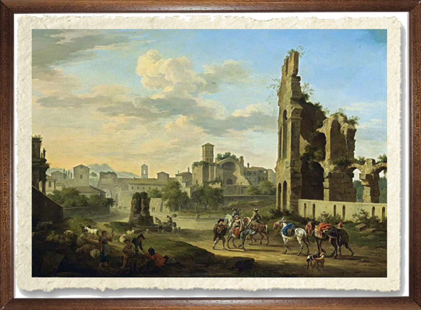 Il dipinto mostra una veduta del Foro Romano con cavalieri e muli con viandanti in primo piano insieme a pastori e il loro gregge che suonano strumenti musicali. È un tipico pezzo realizzato per il mercato dell'arte, ricercato dagli italiani dell'epoca e dai turisti.