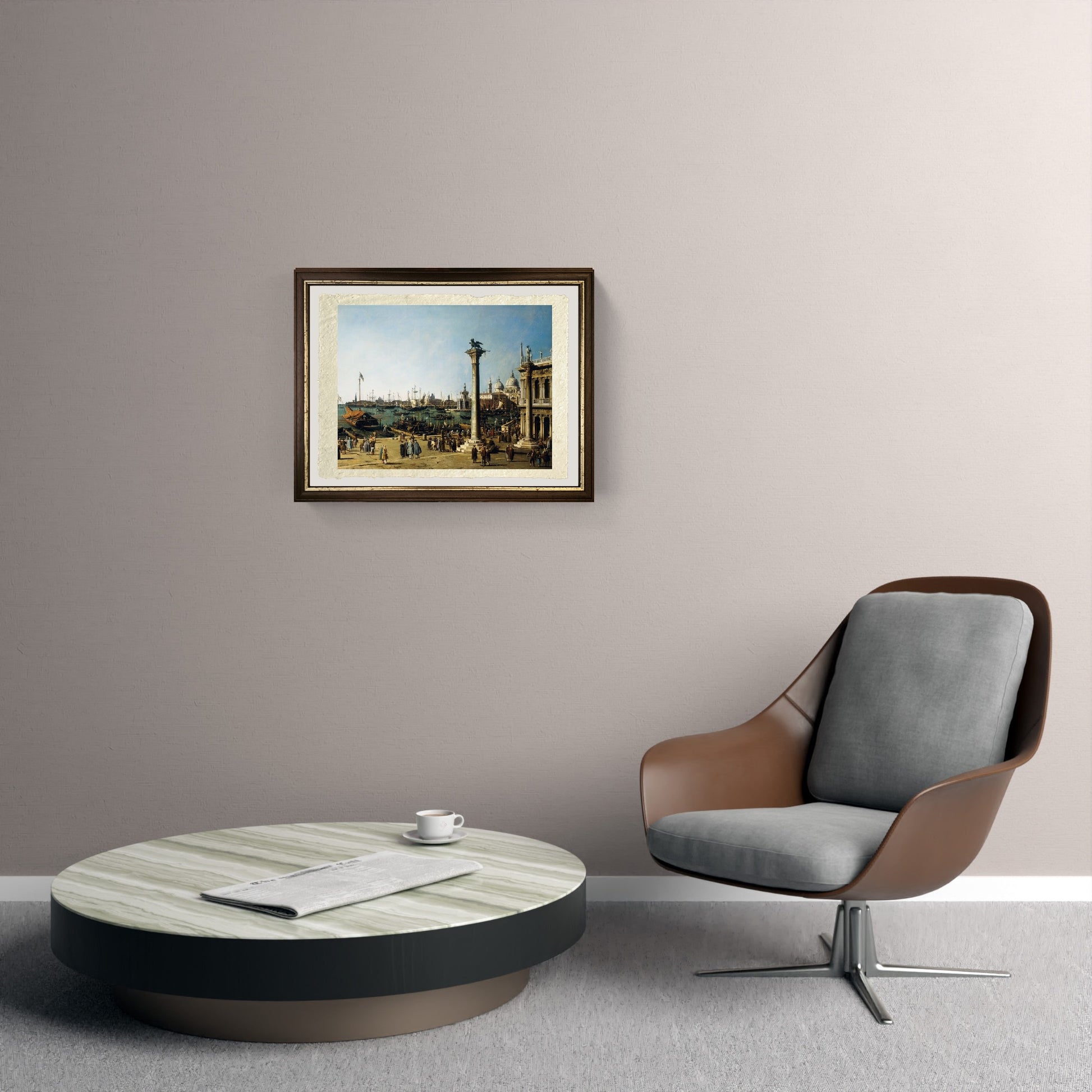 Originale e luminosa rappresentazione del molo di Venezia visto dal bacino di San Marco, realizzata da Giovanni Antonio Canal detto Canaletto. Particolare del dipinto le colonne di San Marco e San Teodoro raffigurate in primo piano. Nel molo vi sono le imbarcazioni ancorate con un via vai di gente. Più sullo sfondo si vedono la cupola della chiesa di Santa Maria della Salute, ed altre navi che stanno facendo manovra per attraccare a molo. Il cielo è sereno, con qualche nuvola bianca all'orizzonte. Il quadro, un olio su tela, non è datato. Esistono alcune varianti create dal Canaletto di questo dipinto.